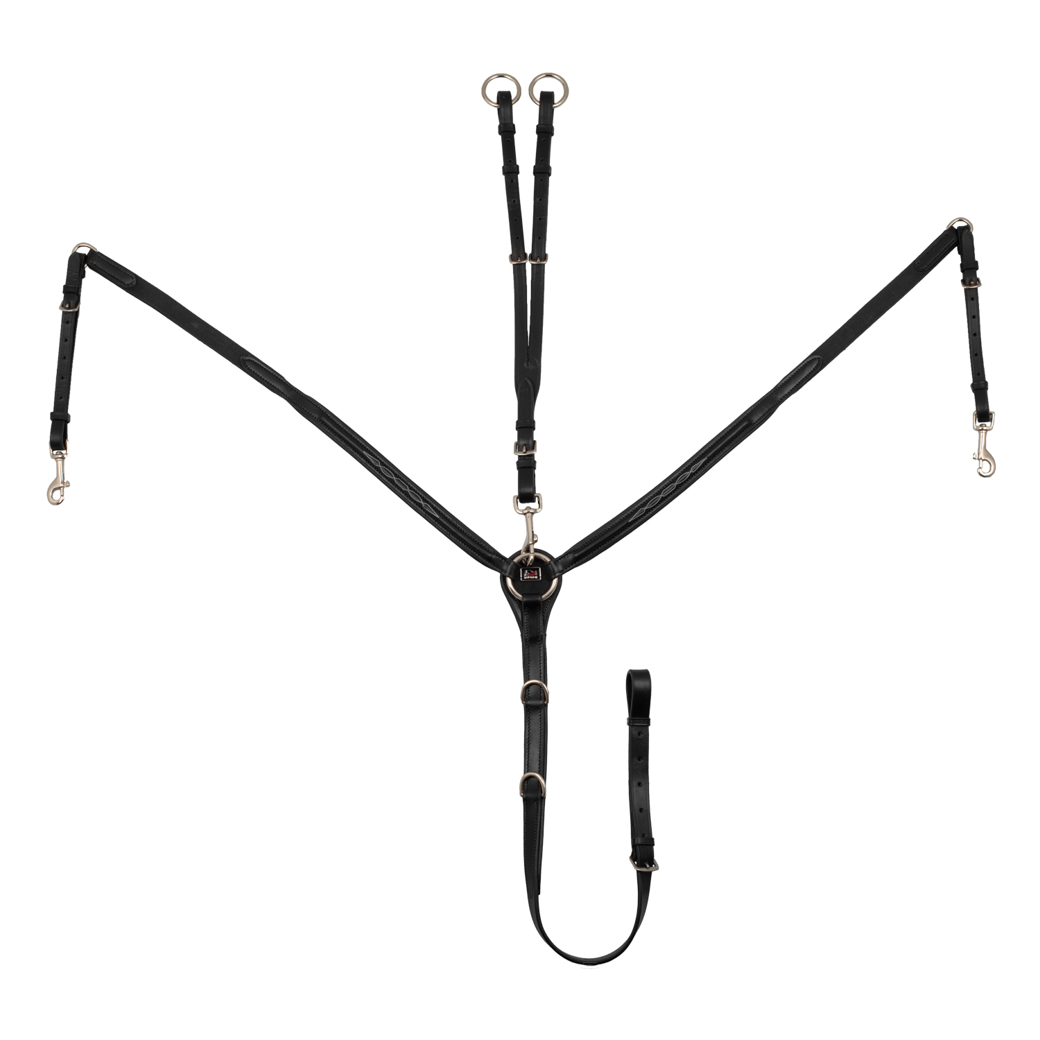 Vorderzeug aus Leder mit drei Befestigungspunkten und abnehmbarem Martingal. Vollständig gepolstert und in allen Anschlüssen verstellbar, sorgt es für optimalen Komfort.