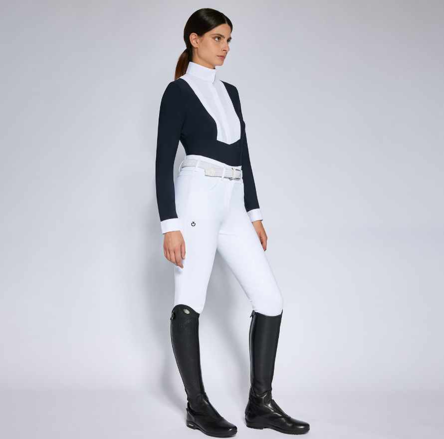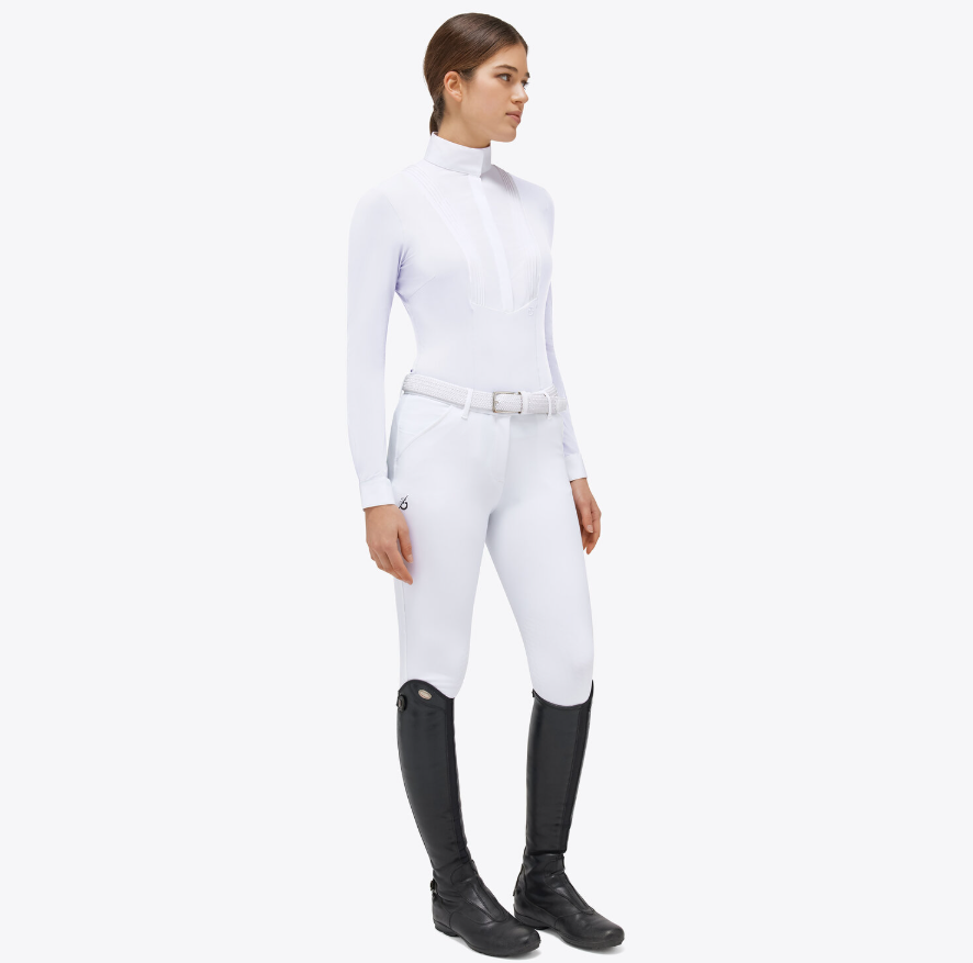 Das Hunter-Turniershirt für Damen vereint Eleganz und Leistung dank des hohen Popeline-Kragens und des gefalteten Latzes mit verstecktem Frontverschluss.