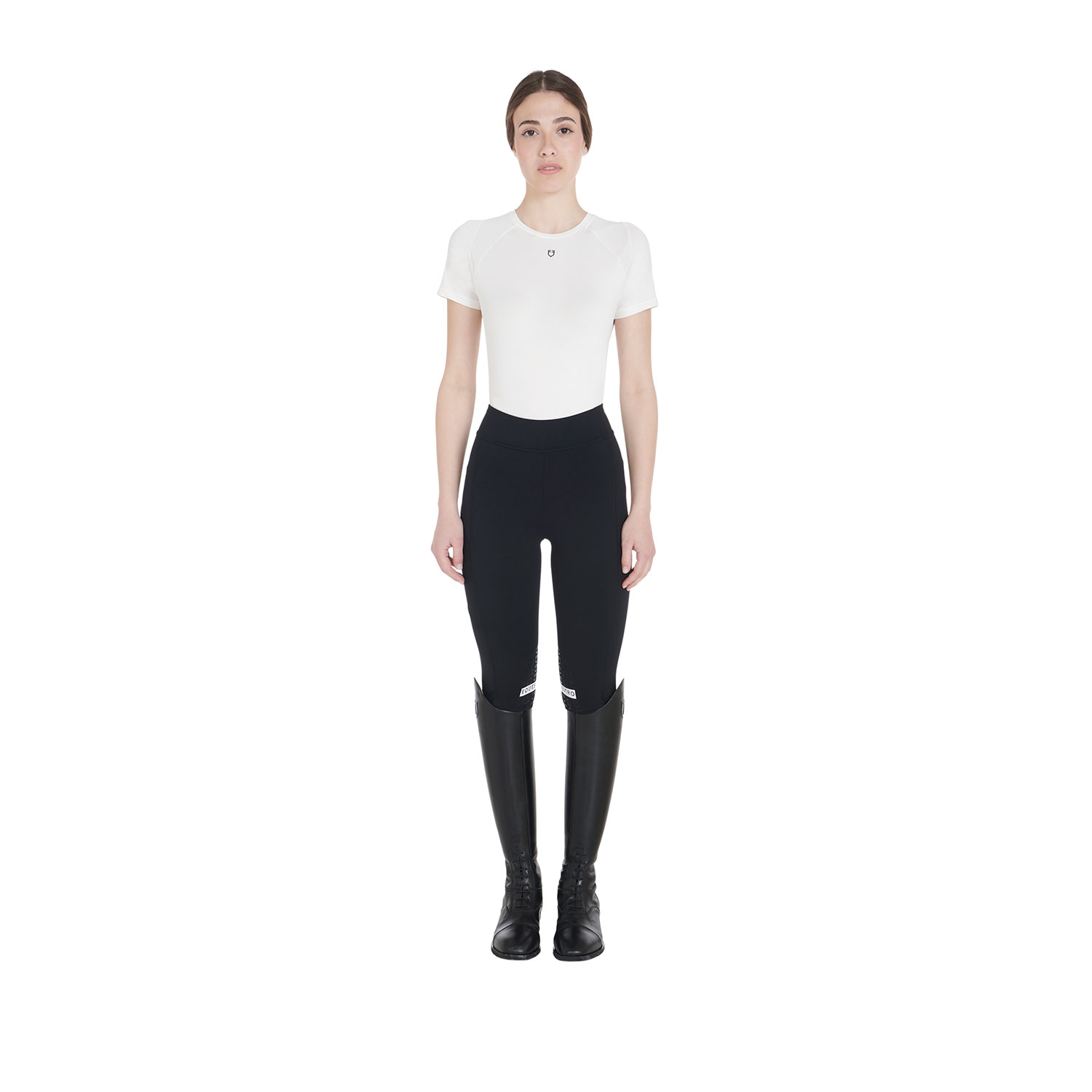 Die leichten Slim-Fit-Damenleggings bestehen aus einem technischen Stoff und bieten Komfort und eine perfekte Passform für jeden Körpertyp. Sie sind mit zwei Seitentaschen ausgestattet, die mit einer Stickerei versehen sind, die das Equestro-Logo darstellt. Nahe am Knie verfügen sie über einen Silikongriff, der die Stabilität im Sattel erhöht und so die Haltung des Trägers verbessert.