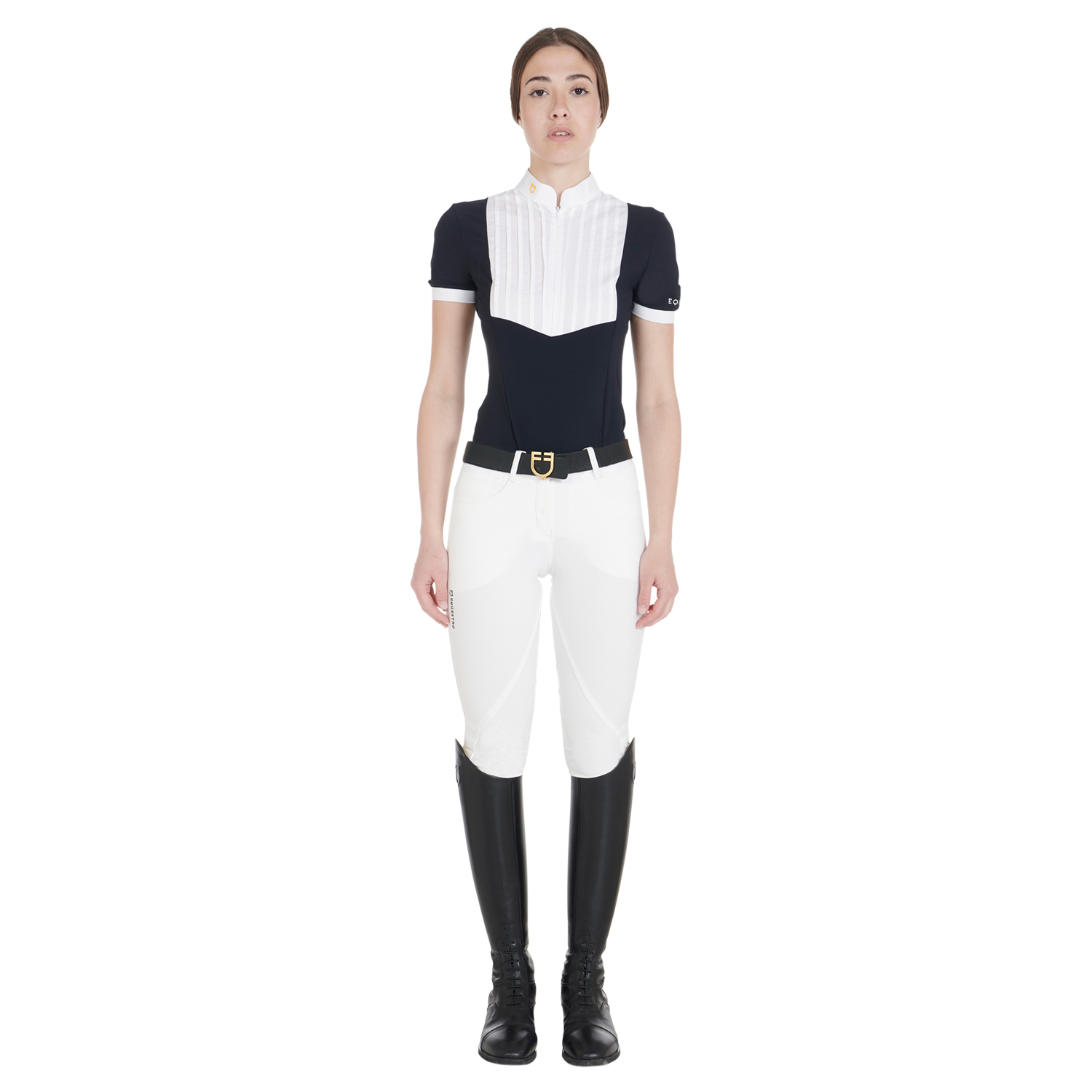 Damenhose Clio aus technischem Gewebe mit Grip am Knie und aufgesticktem Equestro-Schriftzug auf der rechten Seite.