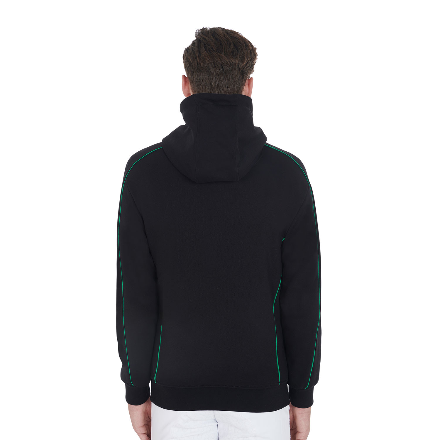 Herren-Sweatshirt aus weicher Baumwolle, ausgestattet mit einem bequemen winddichten Frontreißverschluss und einer verstellbaren Kapuze, die dem Fahrer außergewöhnlichen Komfort bietet. Die Verzierungen mit kontrastierenden Paspeln verleihen einen Hauch von Eleganz und spiegeln den Reitstil voll und ganz wider. Gerippte Bündchen und Bund sorgen für eine einwandfreie Passform.