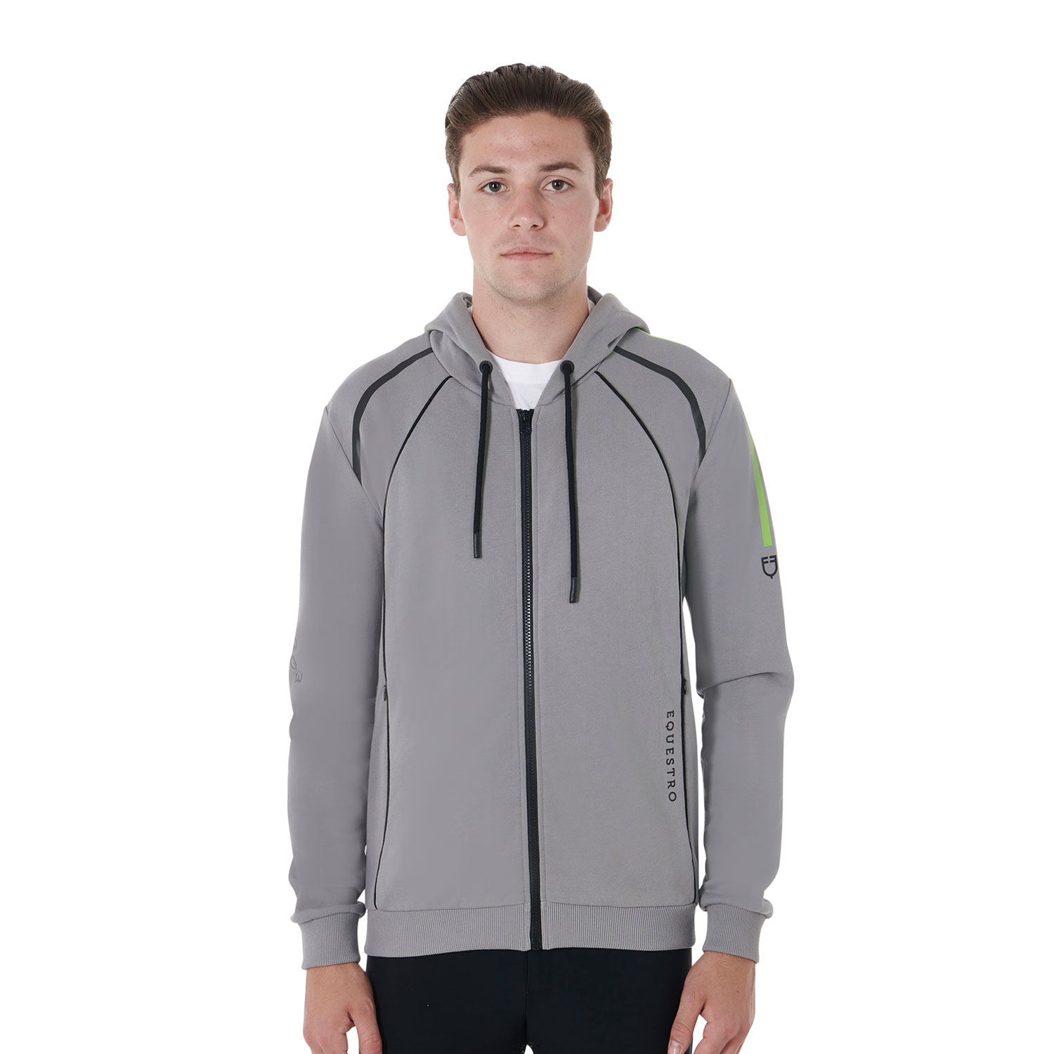 Das Sweatshirt ist mit einem eleganten schwarzen Besatz und einem Aufnäher mit dem Equestro-Logo auf der Rückseite versehen.