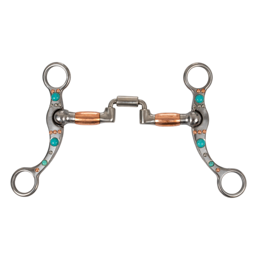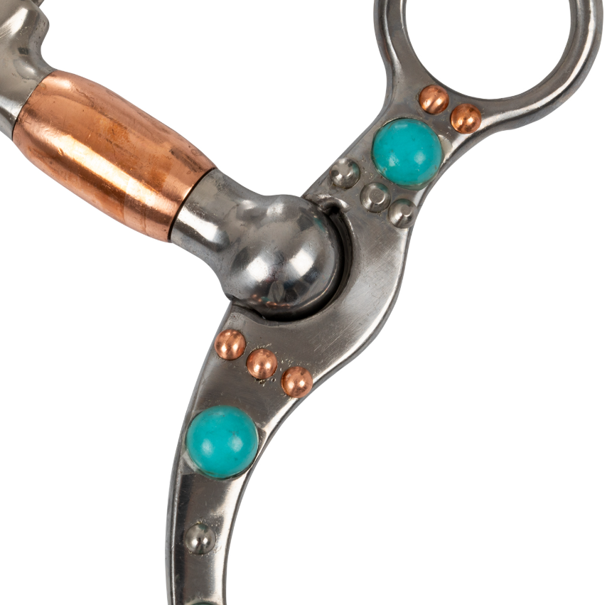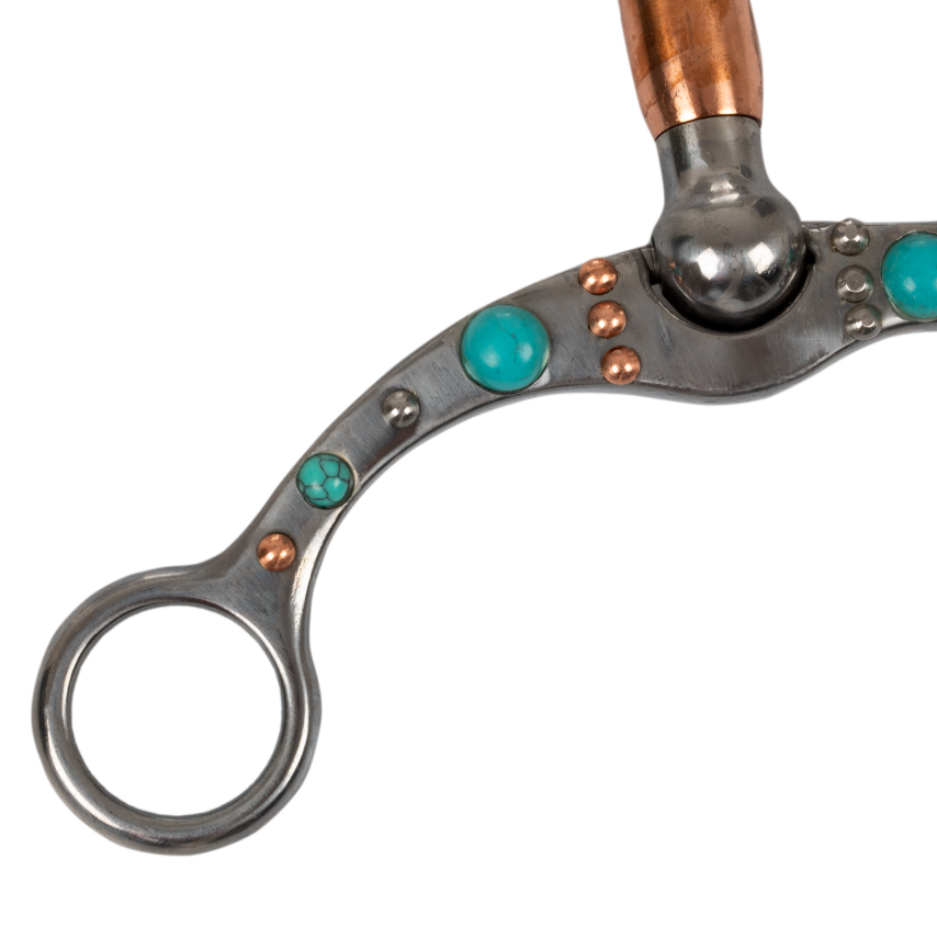 Korrekturgebiss für das Westernreiten aus widerstandsfähigem, mit Verzierungen gearbeitetem Eisen, ausgestattet mit Kupferrollen und türkisfarbenen Perlenapplikationen.