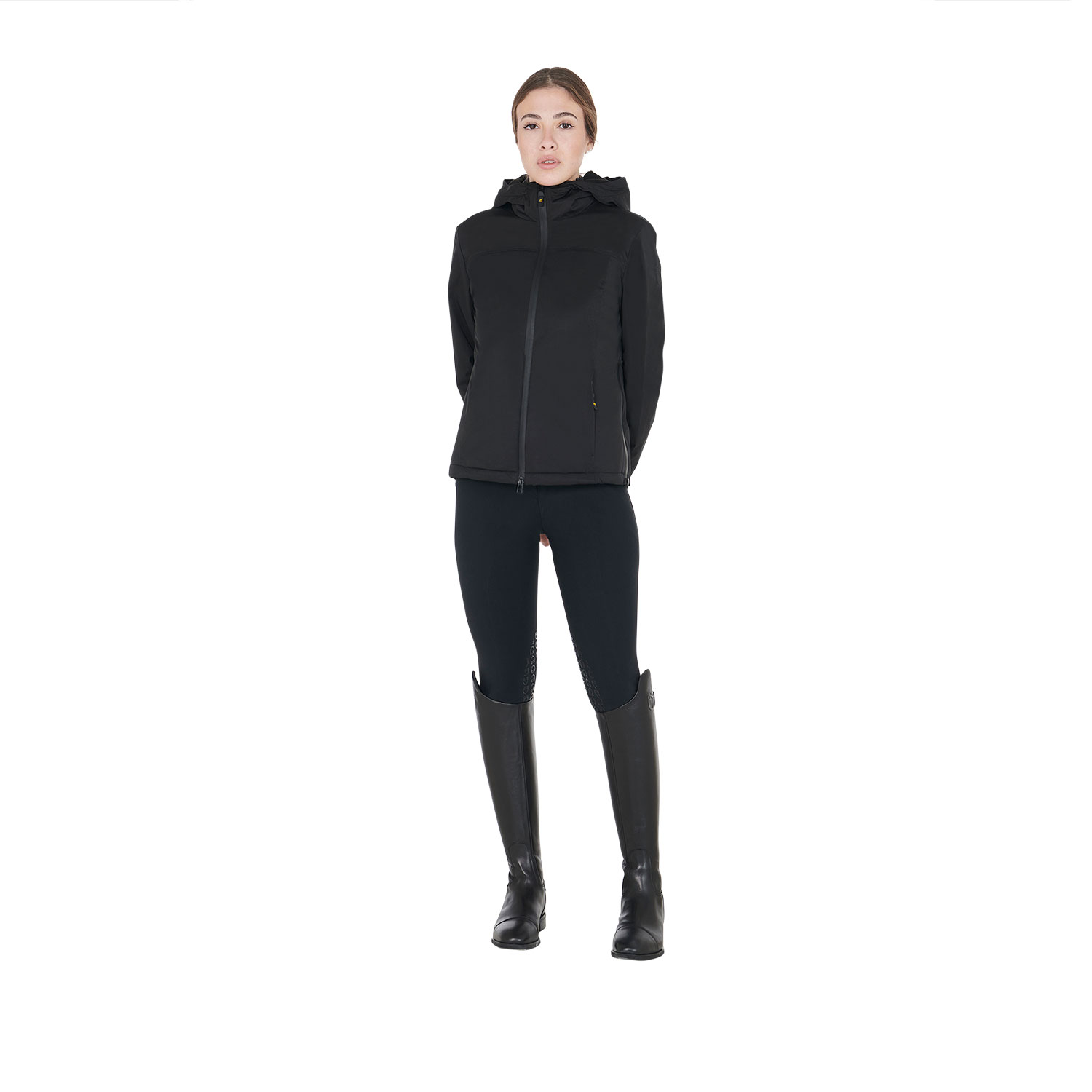 Die schmal geschnittene Damen-Regenjacke ist für Frauen konzipiert, die gerne reiten und ein technisches, aber auch elegantes Kleidungsstück suchen. Sein Außenstoff und der ärmellose Inneneinsatz bieten eine innovative Wärmeisolierung, die hervorragende wasserdichte Eigenschaften mit ausgewogener Innenwärme kombiniert. Abgerundet wird das Kleidungsstück durch eine praktische und elegante verstellbare Kapuze mit Kordelzug, einen Frontverschluss mit wasserdichtem, heißversiegeltem Reißverschluss, zwei Seitentaschen mit unsichtbarem Reißverschluss und verstellbare Ärmelbündchen mit Klettverschlüssen.