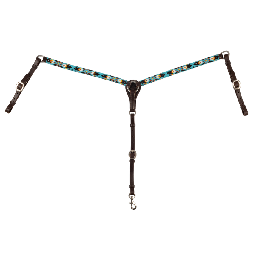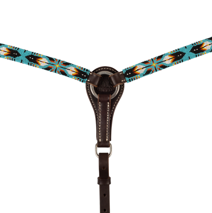 Western-Brustpanzer aus geöltem Leder mit Navajo Sky-Perlen, langlebig und verstellbar, ideal für Komfort und Kontrolle beim Westernreiten.