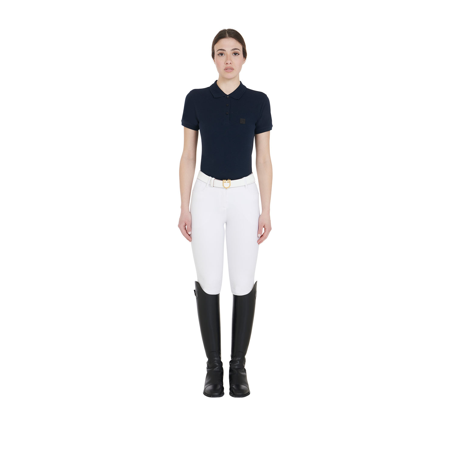 Das Damen-Poloshirt aus gekämmtem Premium-Stretch-Gewebe, das für mehr Stabilität mit Enzymen behandelt wurde, eignet sich sowohl für die tägliche körperliche Aktivität als auch für die Entspannung. Es zeichnet sich durch einen gerippten Rand an den Ärmeln und am Kragen, einen Drei-Knopf-Verschluss und einen Aufnäher mit dem Equestro-Logo auf der Brust sowie ein Schweißband aus.