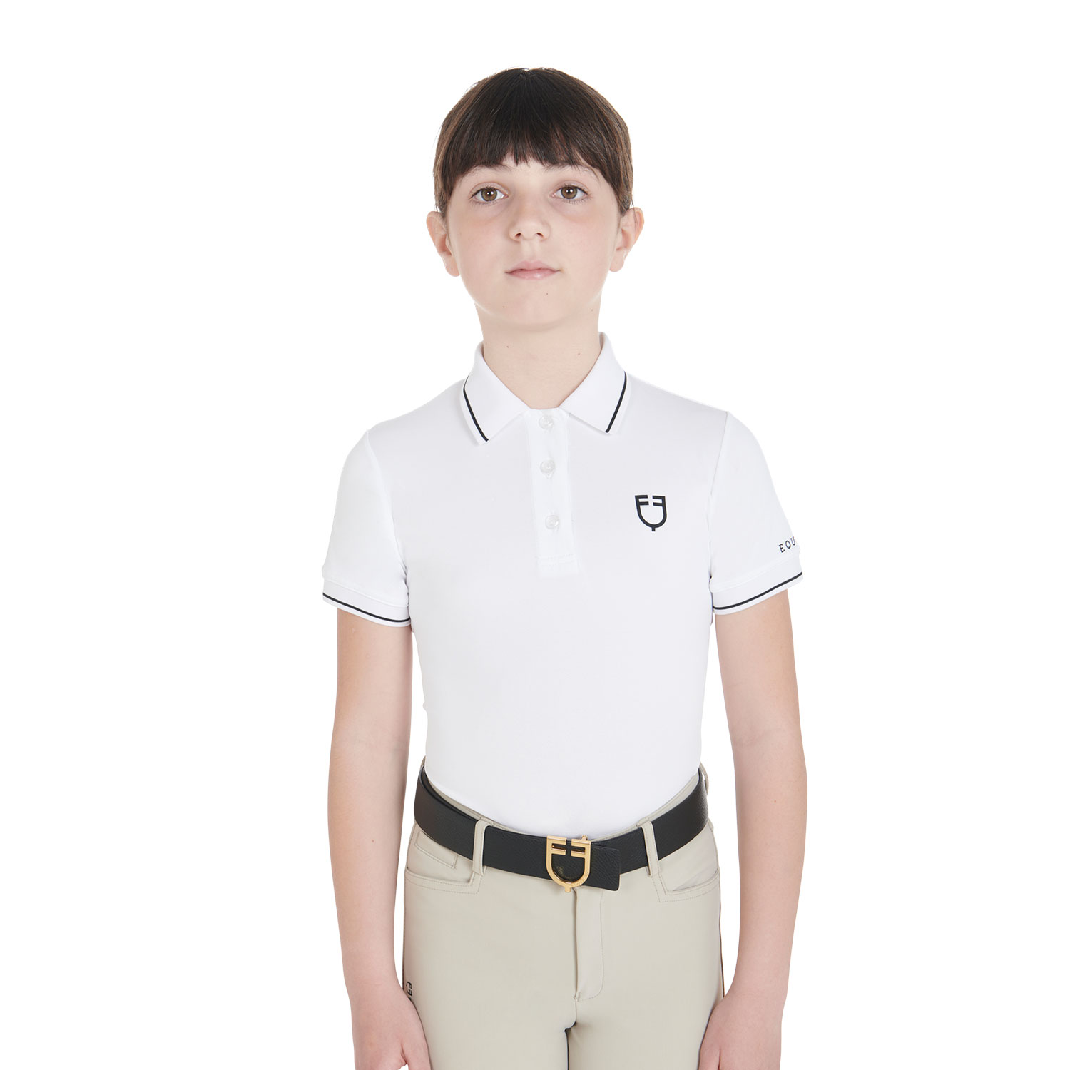 Kinderpoloshirt aus hoch atmungsaktivem technischem Stoff, ideal für den Sommer. Der innovative Stoff fördert die Verdunstung und Verteilung des Schweißes und sorgt so für konstanten Komfort, da das Kleidungsstück immer frisch und trocken ist. Es verfügt über kontrastierende Kanten an Ärmeln und Kragen, einen Drei-Knopf-Verschluss und ist mit dem Equestro-Logo auf der Brust verziert.