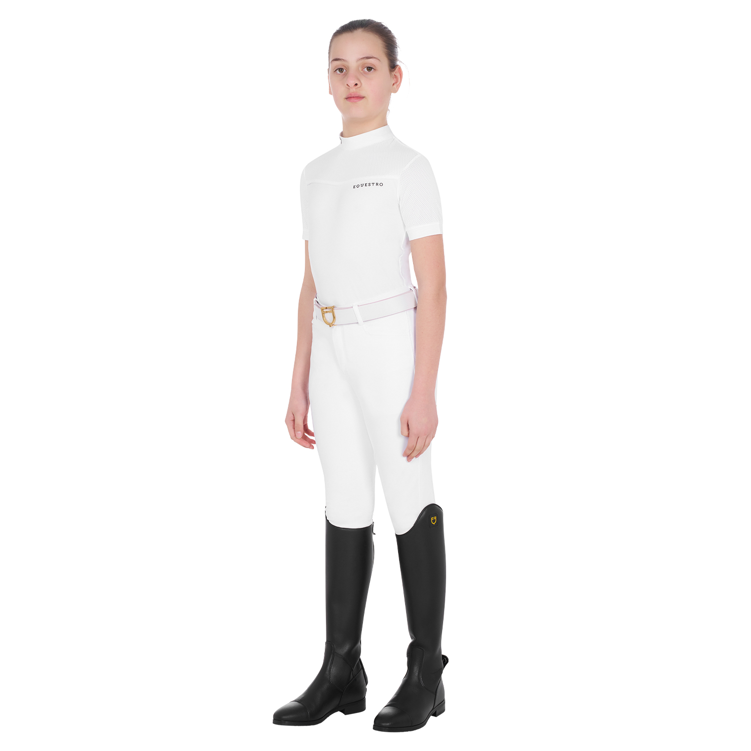 Slim-Fit-Poloshirt mit halben Ärmeln für Mädchen, hergestellt aus technischem Stoff und Mesh, um die Atmungsaktivität zu fördern und eine optimale Körpertemperatur aufrechtzuerhalten. Das feminine Design betont die Form des Körpers und sitzt leicht an der Taille für einen eleganten und bequemen Stil. Dieses Poloshirt wurde für eine einwandfreie Passform und Bewegungsfreiheit entwickelt und ist frisch und leistungsstark. Es ist mit dem Equestro-Logo und einem Schriftzug auf der Brust und entlang der Naht versehen und verfügt über einen Rückenschlitz, der Mode und Funktionalität in einer Lösung vereint.