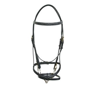 Made of leather with decorative stitching on the front and neck, with English collar adjustable via mouthpiece. Equipped with supports with snap hooks and round stainless steel buckles.