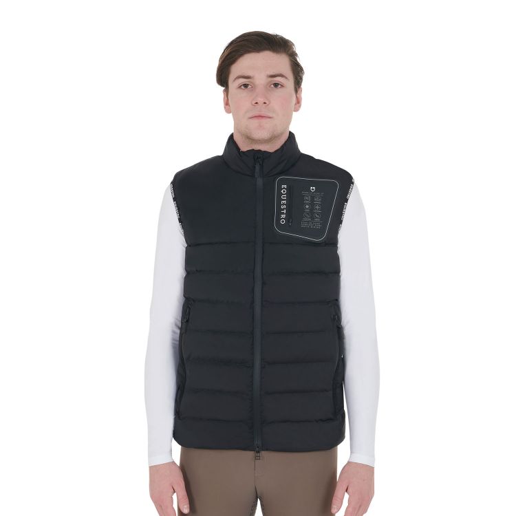 This men's vest in technical fabric features elegant horizontal quilting, perfectly balancing practicality and cutting-edge design. The taped front zip closure is enriched by a comfortable silicone pull, ensuring easy and safe opening and closing. The side pockets not only increase functionality, but integrate harmoniously into the slender and tapered design of the garment. The personalized fit is guaranteed by the adjustable drawstring at the bottom, which offers an optimal balance between comfort and grip. A distinctive touch is given by the silicone patch on the chest, underlining the uniqueness and authenticity of the garment. Combining traditional elements with contemporary details and functionality, this vest embodies timeless style, versatile and ideal for a distinctive look, ready to face challenges in style.