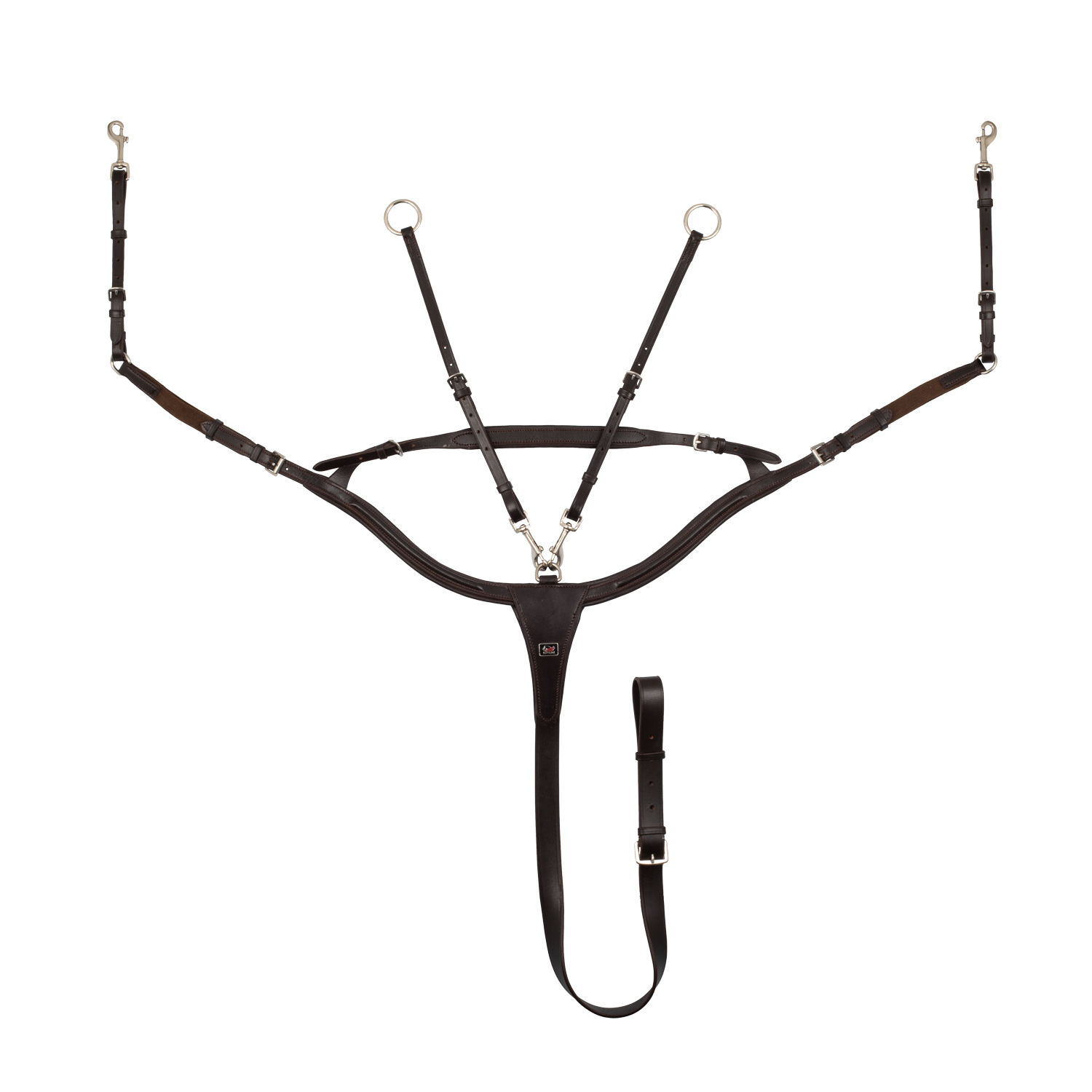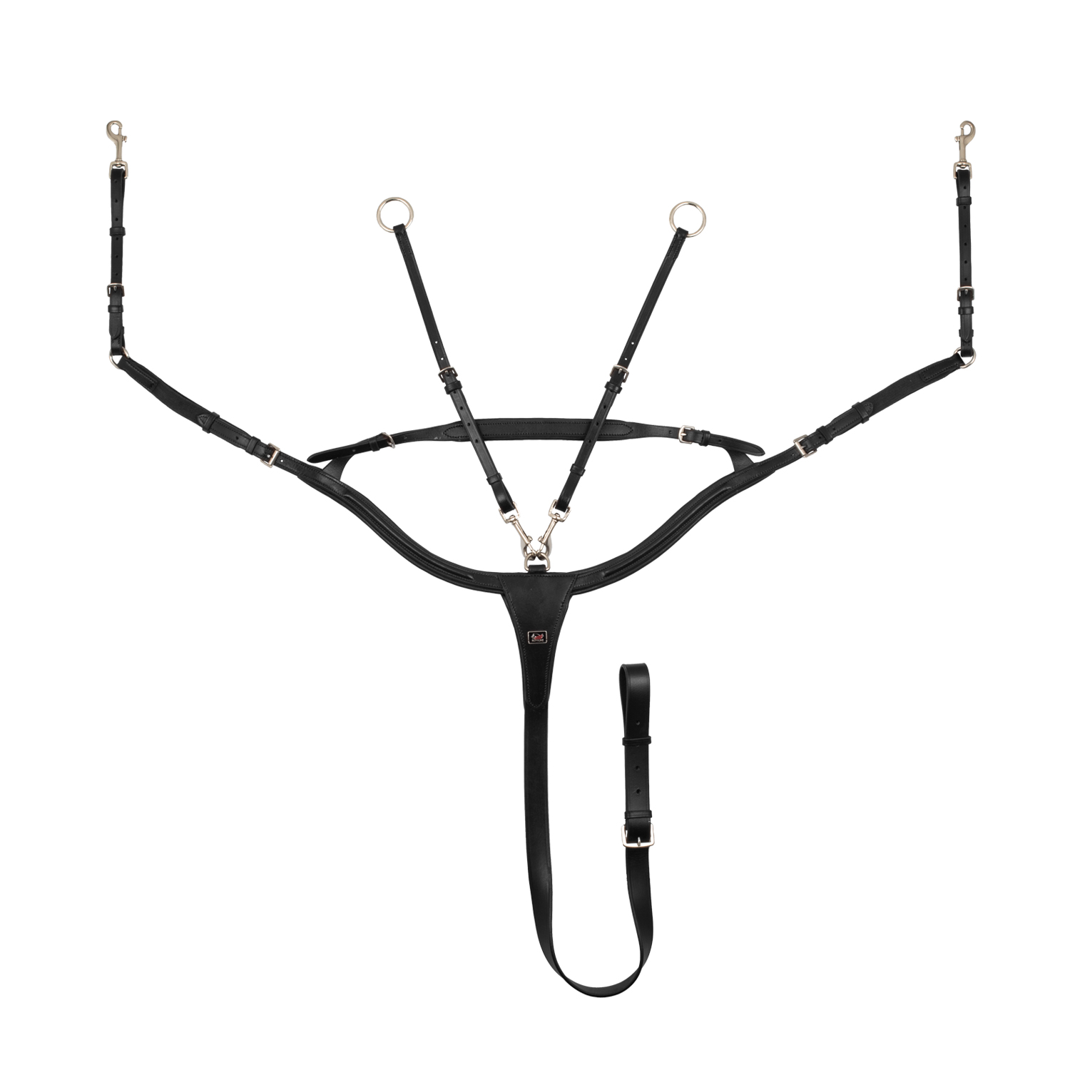 Anatomical padded leather breastplate, equipped with detachable bridge and fork. Reduces movements of the saddle and the horse's head.