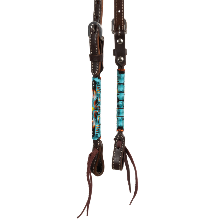 Navajo Sky Western bridle in oiled leather with one ear, embellished with elegant Navajo style beading.