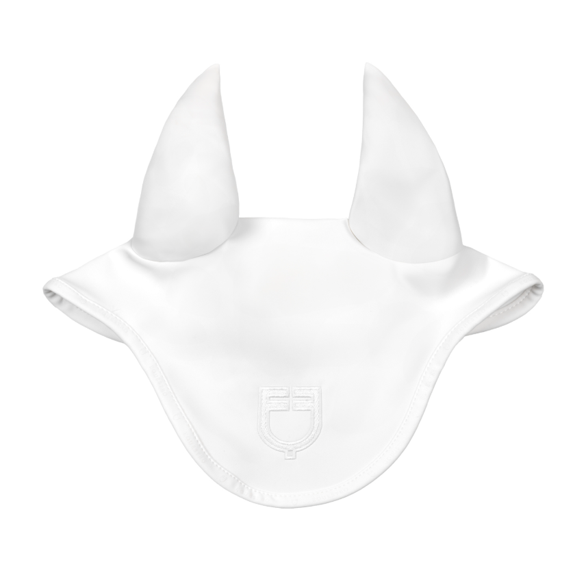 Breathable technical fabric cap with logo, designed to protect the horse's ears from insects and reduce noise, ensuring comfort and concentration during work.