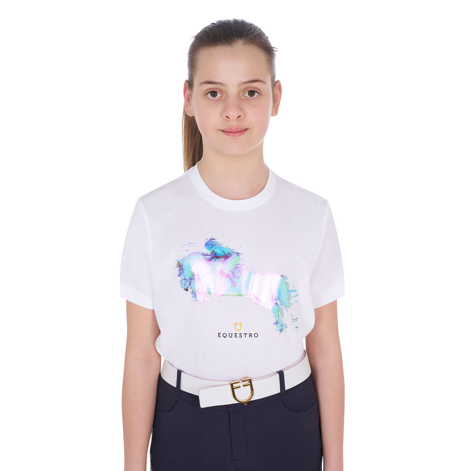 This slim fit t-shirt for girls is made with high quality soft cotton, ensuring freedom of movement and exceptional comfort. Thanks to its ability to absorb moisture, it is ideal for those who practice horse riding. Its distinctive feature is a multicolored print that portrays a rider and a horse in full jump, further enriched by the Equestro logo and writing. The composition of the fabric gives an elegant texture and an extraordinary sensation of softness to the touch, ensuring unparalleled comfort.