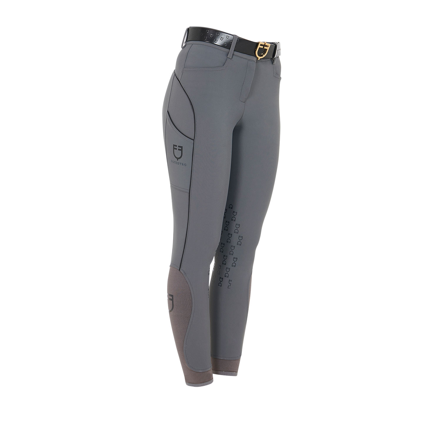 Slim fit women's trousers made of a bi-elastic and breathable technical fabric, which molds perfectly to the body ensuring freedom without restrictions. They feature an internal elastic band at the waist with silicone inserts for an optimal fit on the rider. The transparent knee grip provides control and hold on the saddle, while promoting complete agility in movement. The Lycra element at the ankle makes it easier to put on and increases ventilation during daily activities. These pants also offer convenient front and side pockets. Contrasting piping details along the seams add a distinctive touch of elegance, reflecting Equestro's unique style.