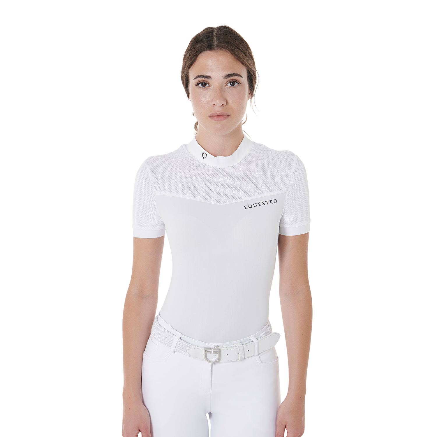 Slim fit women's polo shirt with short sleeves, made of technical fabric and mesh, which promotes the evaporation and dispersion of sweat. Thanks to its breathable properties, it maintains an optimal body temperature. The feminine cut follows the lines of the body, cinching in at the waist to enhance the silhouette. This garment offers freshness, high performance, an excellent fit and complete freedom of movement. The polo is enriched with the Equestro logo and writing on the chest along the seam and features a back vent for a touch of fashion and functionality.