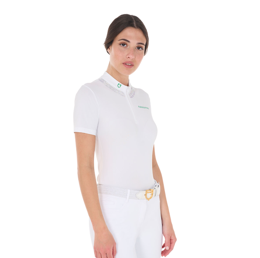 Women's slim fit short-sleeved polo shirt in breathable technical fabric, enriched with elegant rhinestone applications. It combines lightness, style and ideal performance for the summer season.