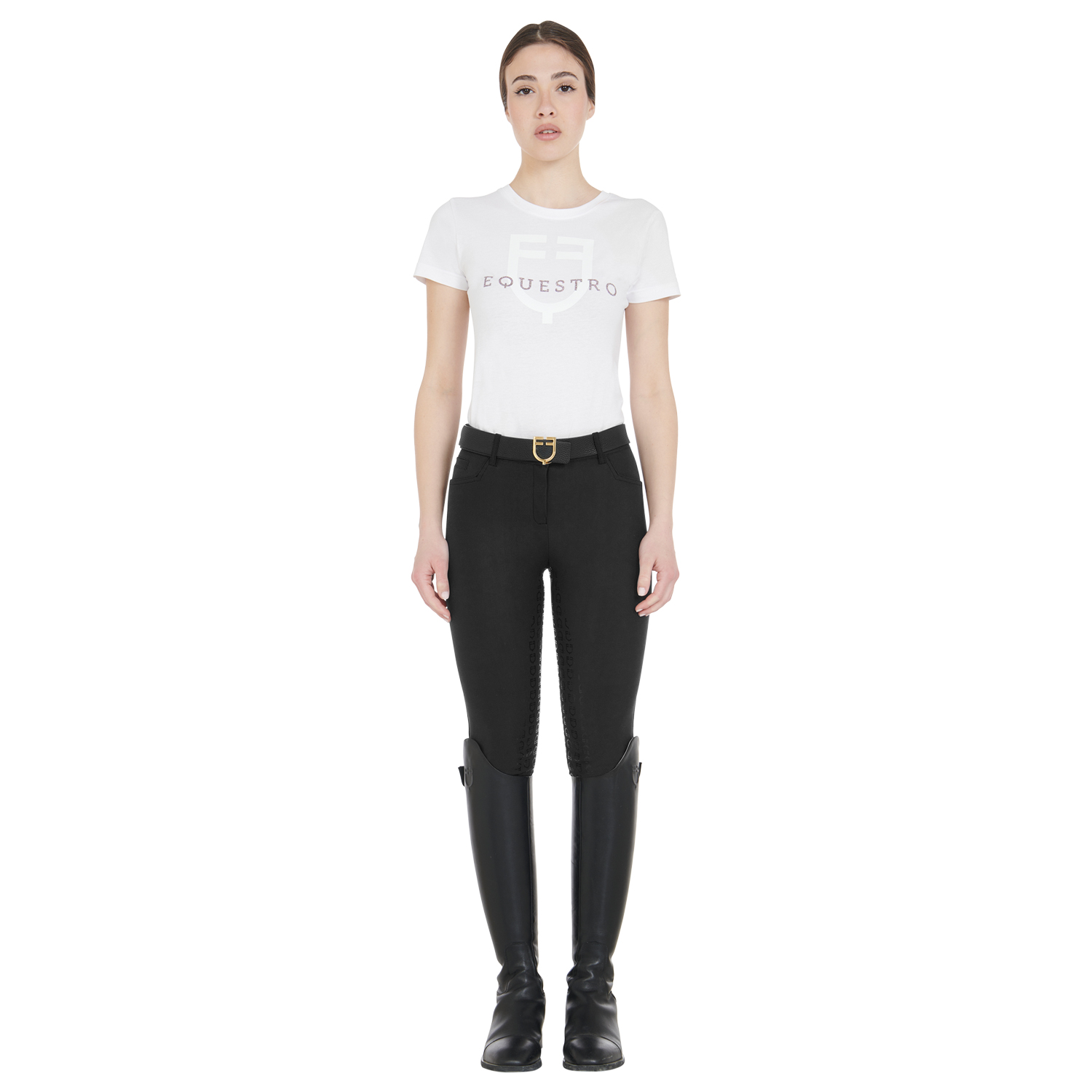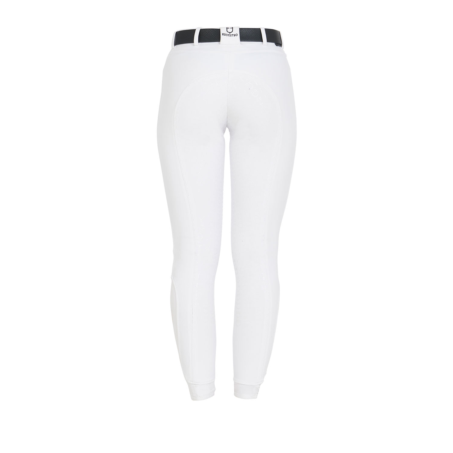 The tight-fitting women's trousers, made of bi-elastic and breathable technological fabric, boast practical and functional front pockets. An innovative silicone grip system with the Equestro logo is positioned on the back and inside of the knee, ensuring superior stability and a secure grip on the saddle. These features, together with the internal grip band at the waist which promotes freedom of movement and increases the feeling of safety on horseback, distinguish this garment. To optimize the fit and ensure better ventilation, a Lycra panel has been inserted at the base of the ankle.