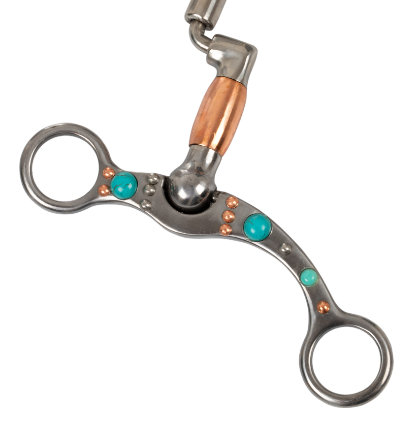 Bocado corrector para monta western en hierro resistente trabajado con decoraciones, dotado de rodillos de cobre y aplicaciones de perla turquesa.
