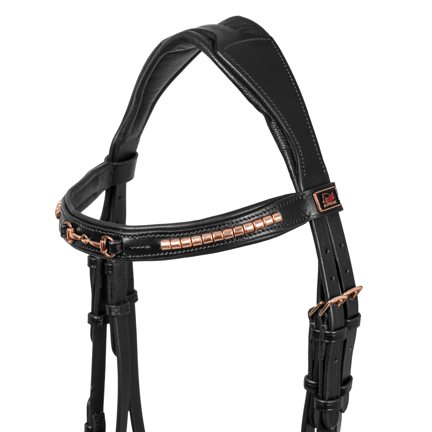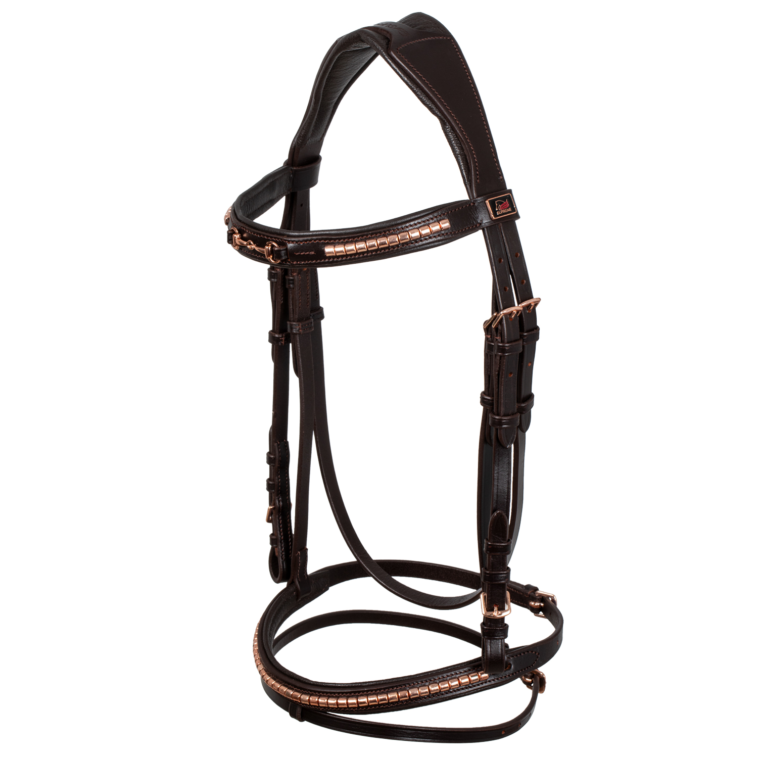Cabezada inglesa Snaffle Rose Gold, fabricada en piel suave, diseñada para ofrecer un excelente rendimiento y un confort superior.