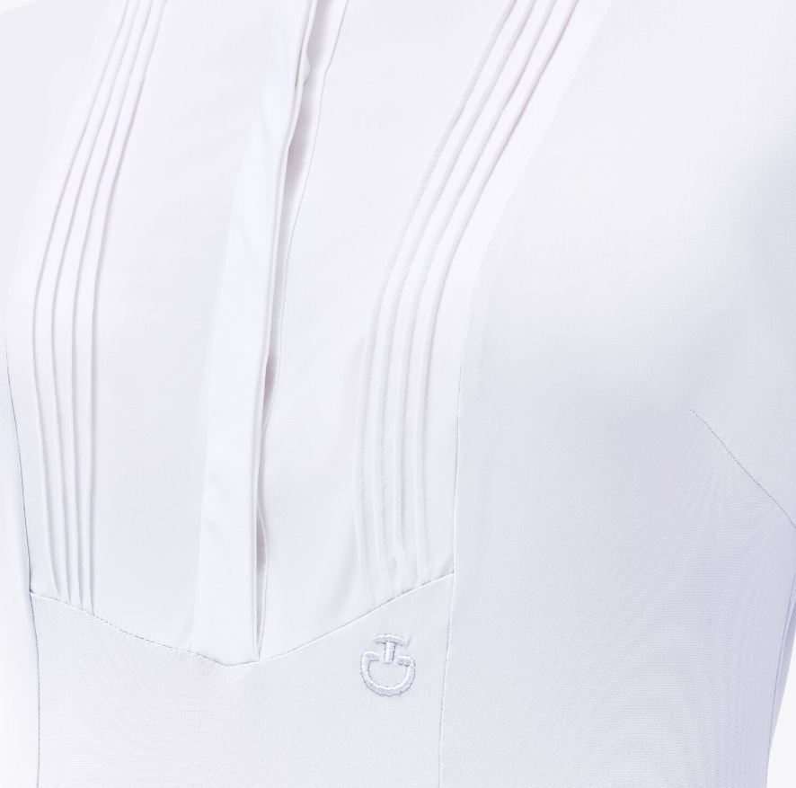 La camiseta de competición para mujer Hunter combina elegancia y rendimiento gracias al cuello alto de popelina y al peto plisado con cierre frontal oculto.