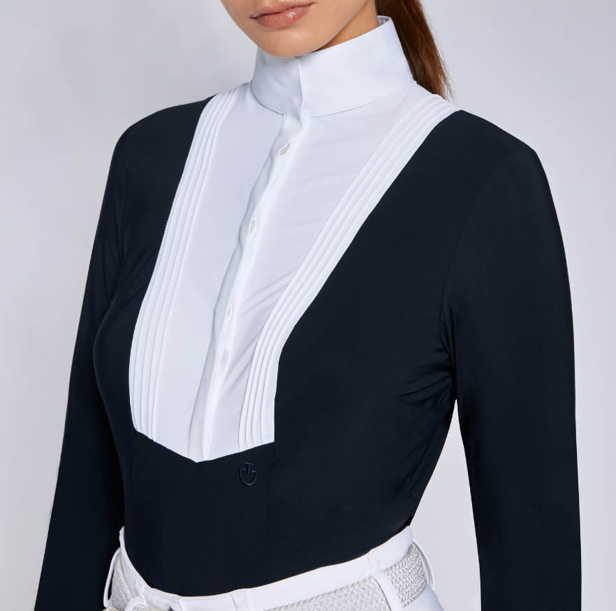 Camiseta de competición mujer en jersey técnico elástico, con manga larga y cierre frontal con botones ocultos.