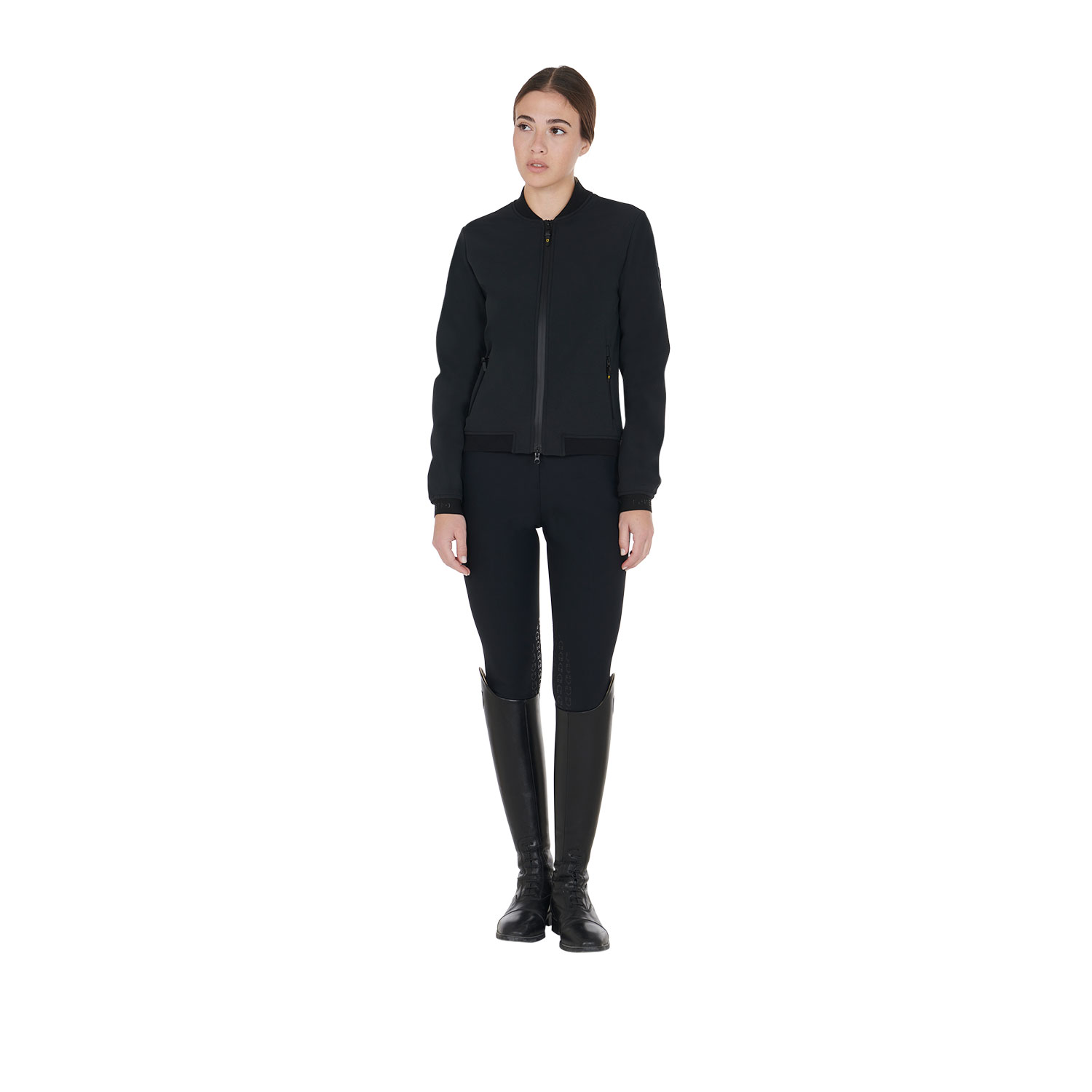 Chaqueta deportiva de mujer estilo bomber confeccionada en tejido técnico, dotada de cierre frontal con cremallera cortavientos para garantizar la máxima protección frente a las bajas temperaturas.