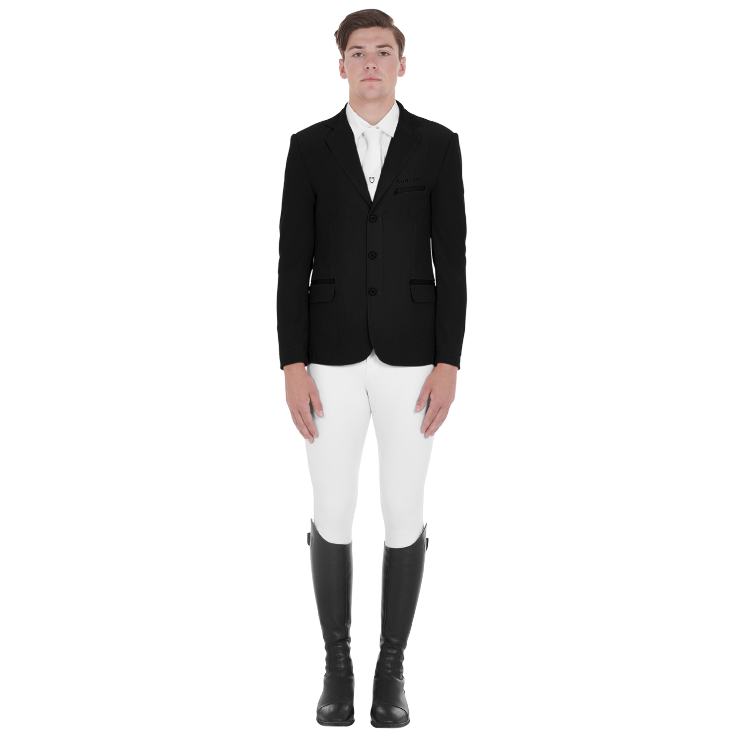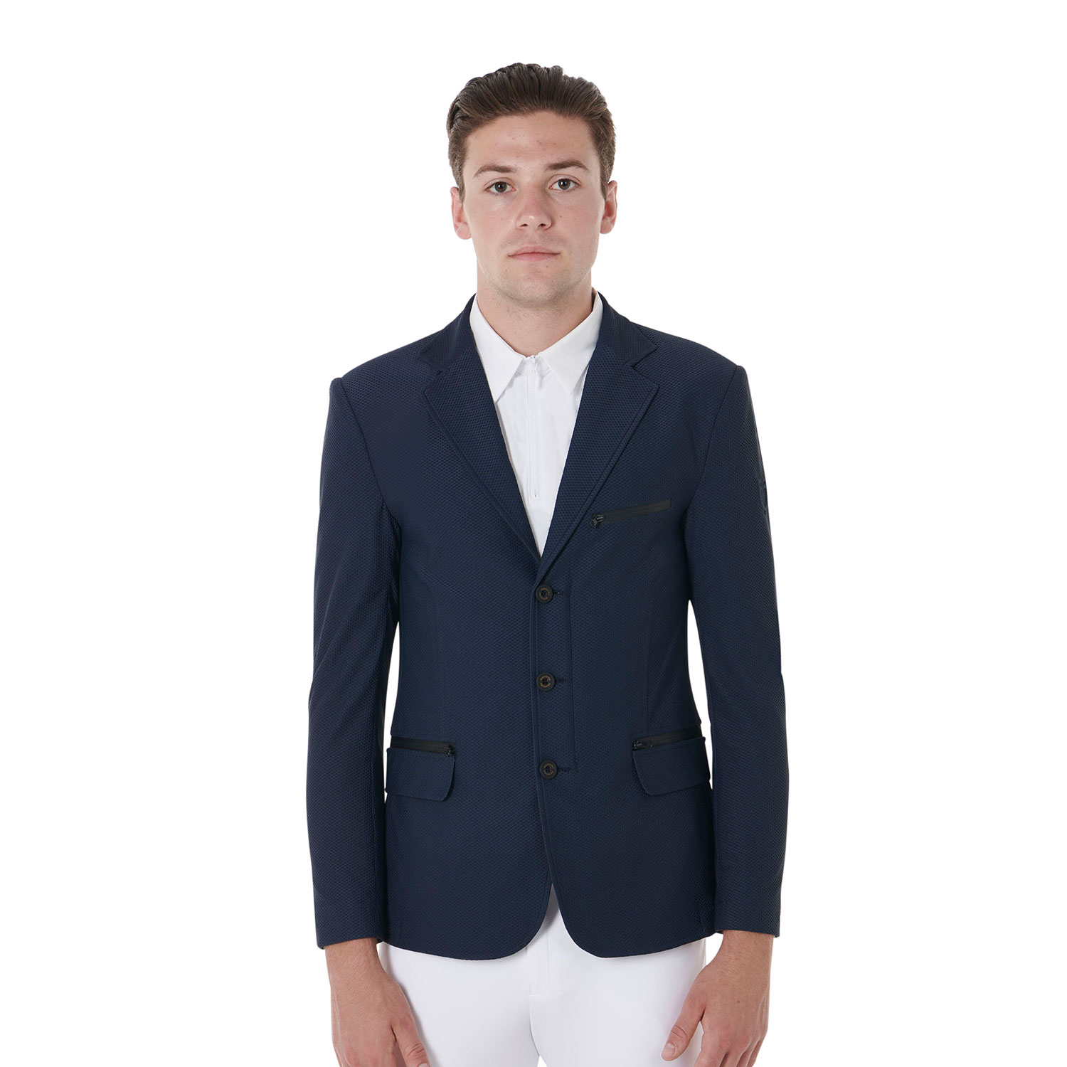 La chaqueta de competición para hombre presenta un elegante diseño de tres botones, confeccionada con tejido perforado de alta calidad que garantiza una alta transpirabilidad, ideal para el verano. Los bolsillos de fuelle con cremallera revestida y el bolsillo en el pecho con el logo Equestro estampado tono sobre tono enriquecen la prenda. Su particular diseño asegura un ajuste perfecto, un confort óptimo y una total libertad de movimientos, adaptándose perfectamente a la actividad deportiva manteniendo la elegancia distintiva de los productos Equestro.