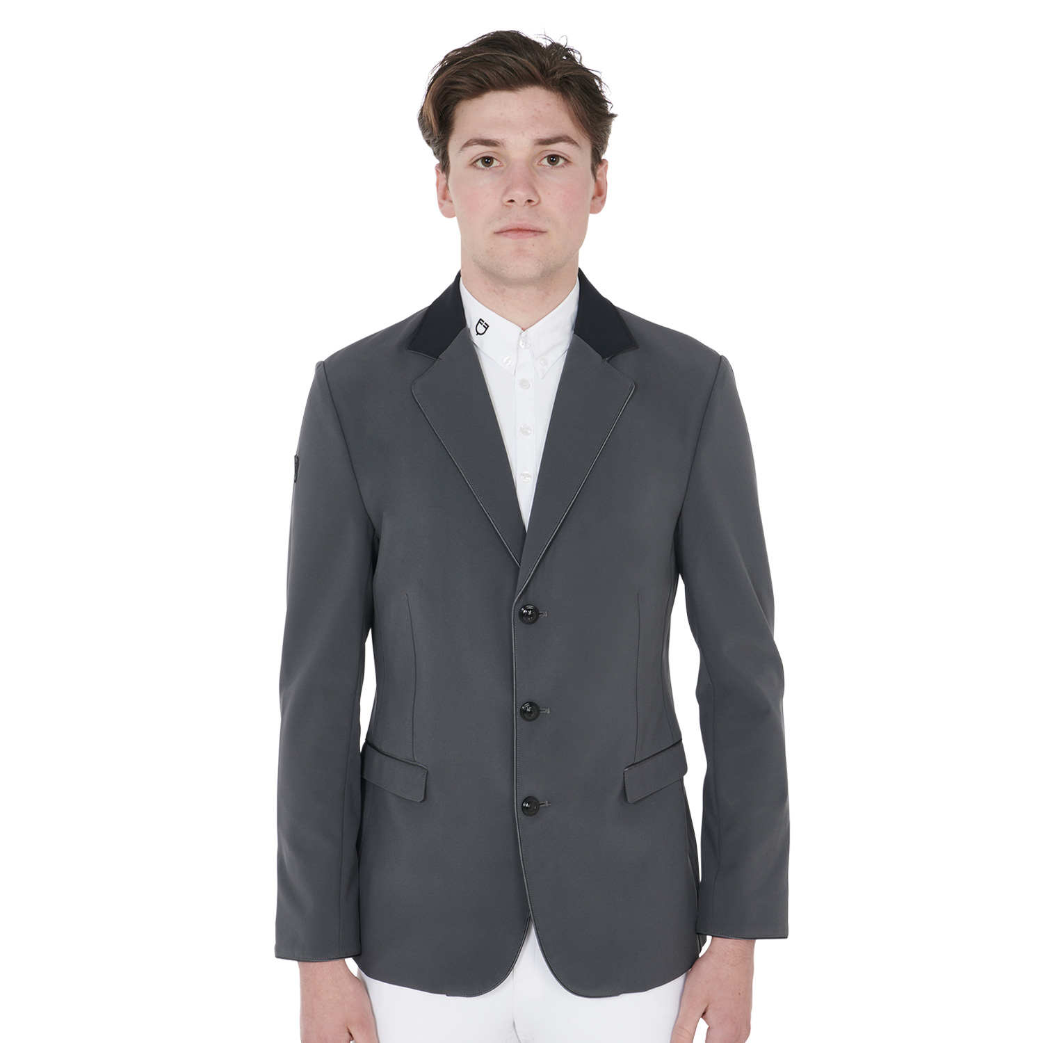 Chaqueta de competición para hombre, caracterizada por tres botones y confeccionada en un tejido técnico transpirable y ultraligero de alta calidad. Presenta cuello de ante, forro interno, bolsillos de fuelle y un parche con el logo de Equestro en el hombro.