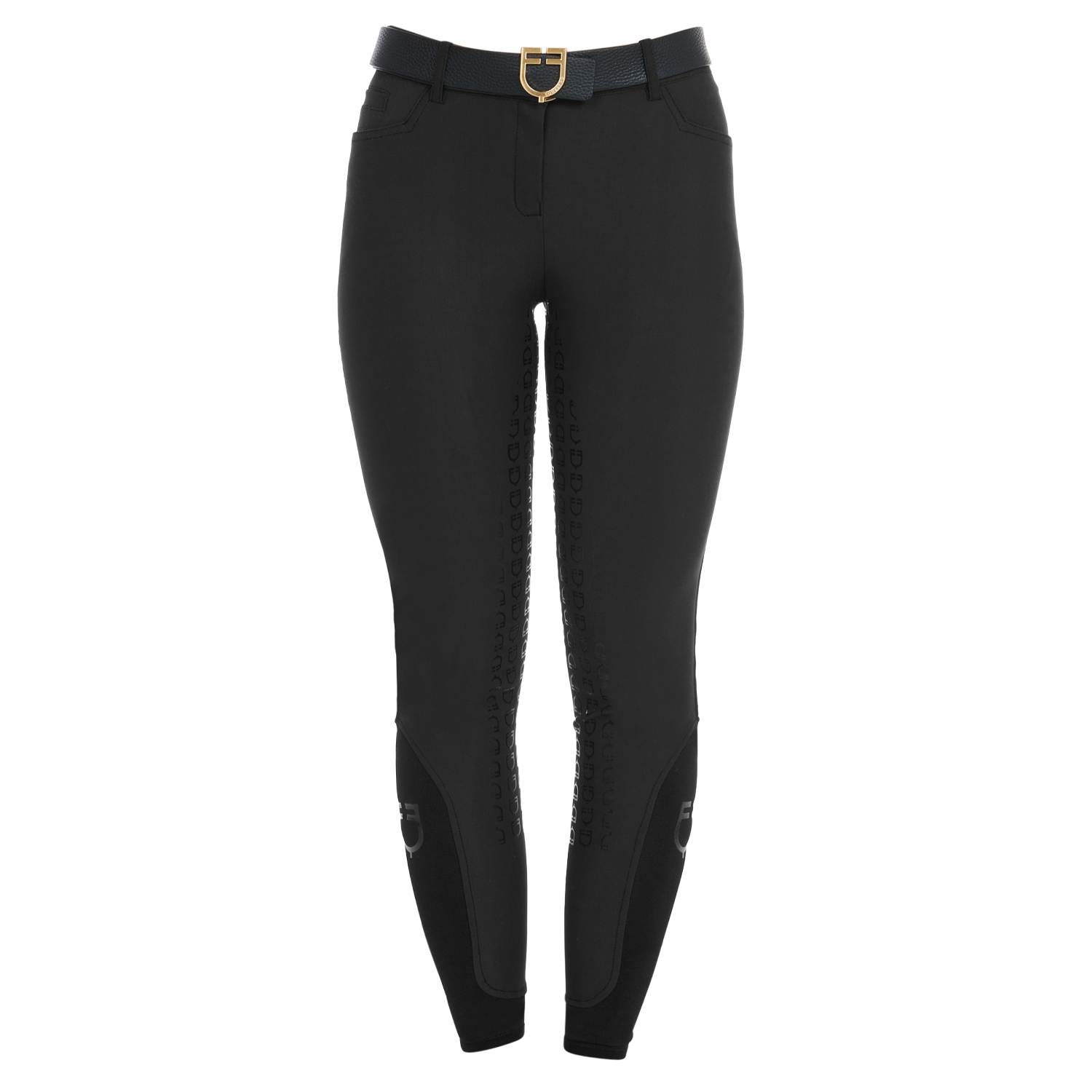 Estos pantalones de mujer de corte ceñido, confeccionados en tejido tecnológico bielástico y transpirable, cuentan con prácticos y funcionales bolsillos delanteros. Un innovador sistema de agarre de silicona con el logotipo de Equestro se coloca en la parte posterior e interior de la rodilla, lo que garantiza una estabilidad superior y un agarre seguro del sillín. Estas características, junto con la banda de agarre interna en la cintura que favorece la libertad de movimientos y aumenta la sensación de seguridad a caballo, distinguen esta prenda. Para optimizar el ajuste y garantizar una mejor ventilación, se ha insertado un panel de Lycra en la base del tobillo.