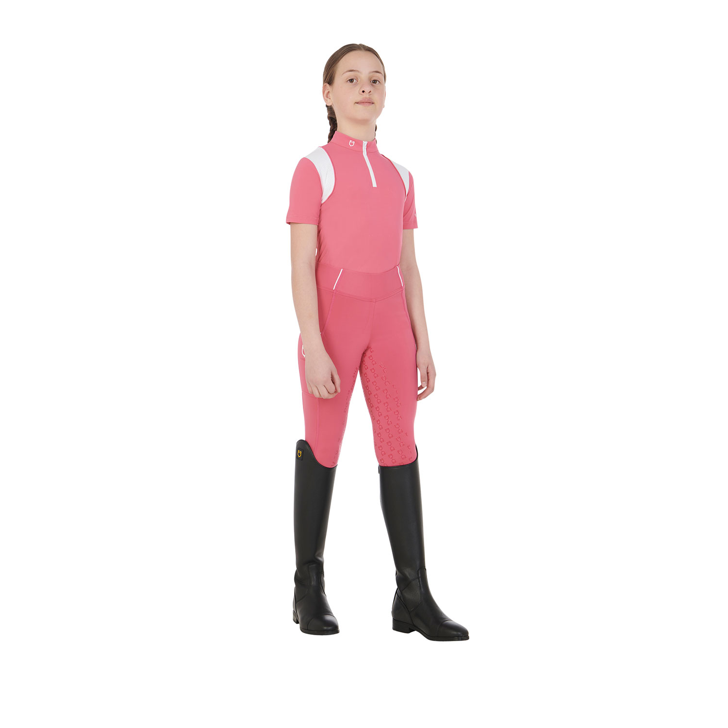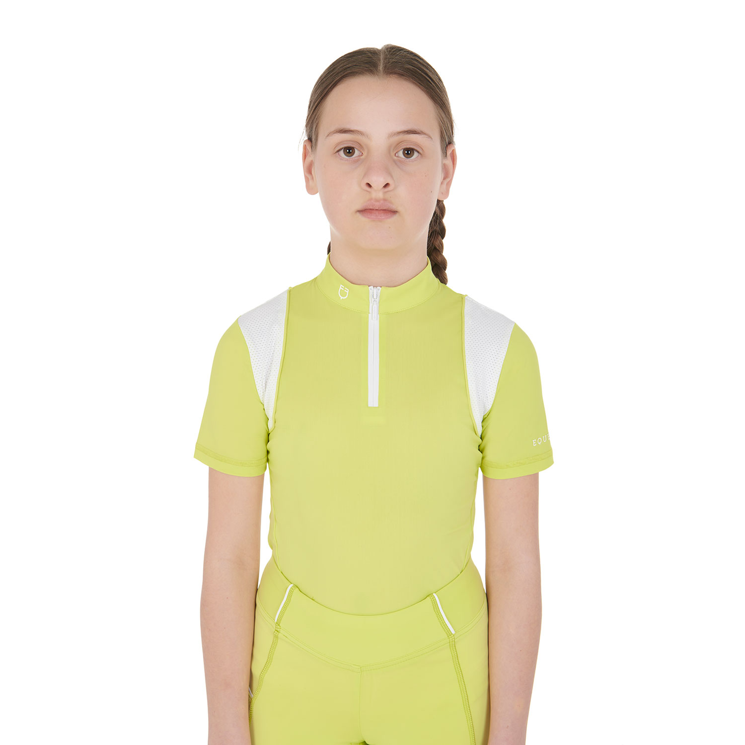 Camiseta slim fit para niña, ideal para entrenar, confeccionada en tejido técnico transpirable que favorece la evaporación del sudor manteniendo la frescura y un rendimiento óptimo. El diseño combina comodidad y practicidad con detalles refinados: bordes rematados, escritura "Equestro" en el lateral, logo en el cuello y en la espalda. Con un cierre de cremallera con sistema cortavientos y un elegante cuello mao, esta camisa es una opción sofisticada para actividades deportivas.