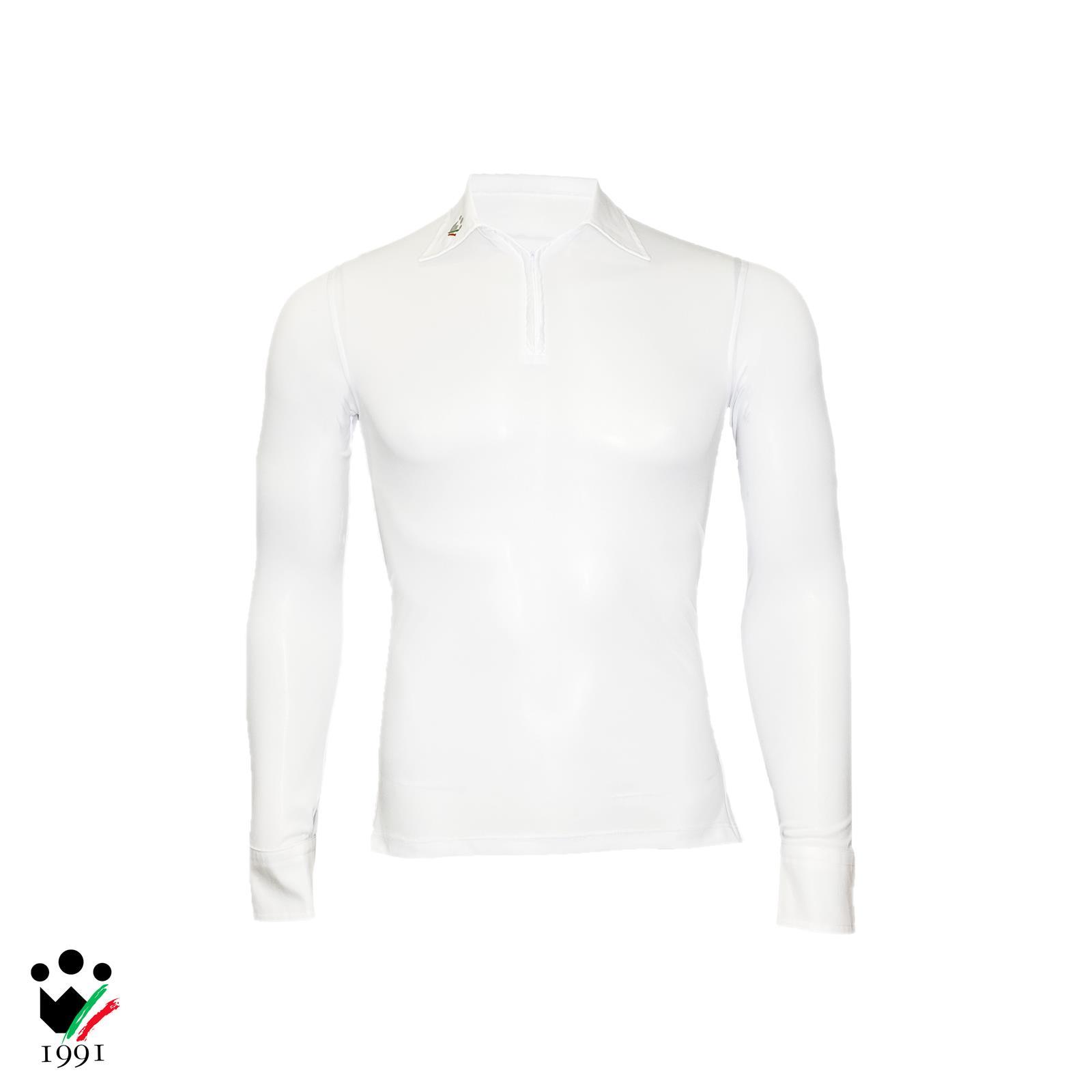 Modelo Extra Slim Fit en color blanco, con cuello bordado con la corona Equitatus 1991.