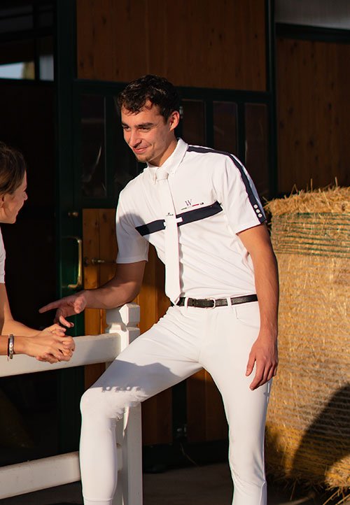 El Polo Whip destaca por su cuello clásico confeccionado en popelín de alta calidad, ideal para combinar con cualquier corbata. Presenta el logo de Whip Italy bordado en el pecho, adornado con una elegante banda azul mar y una banda de corbata blanca. Las mangas están realzadas con refinadas aplicaciones de nácar.
