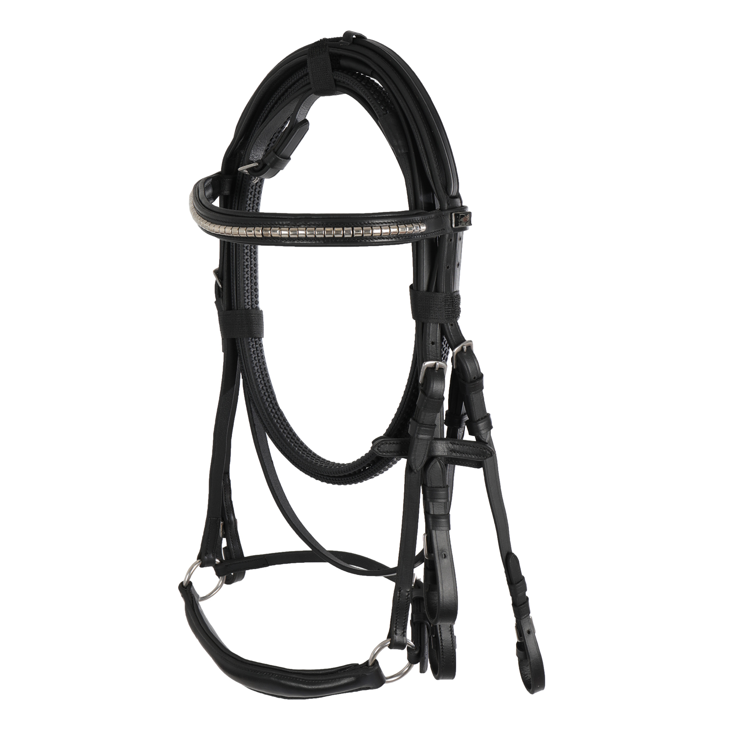 Bridon anglais en cuir avec muserolle ALLEMANDE à anneaux, complet de rênes en caoutchouc.