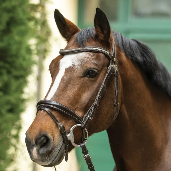 Bride avec muserolle et muserolle en cuir italien pleine fleur avec surpiqûres contrastées. Frontal et muserolle ornés de cristaux. Têtière profilée et rembourrée, comme le frontal et la muserolle, en cuir souple. Livré avec rênes.
