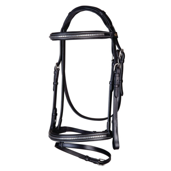 Bridon en cuir italien pleine fleur fin, caractérisé par des coutures contrastées. Comporte des détails Clincher sur le frontal et la muserolle.