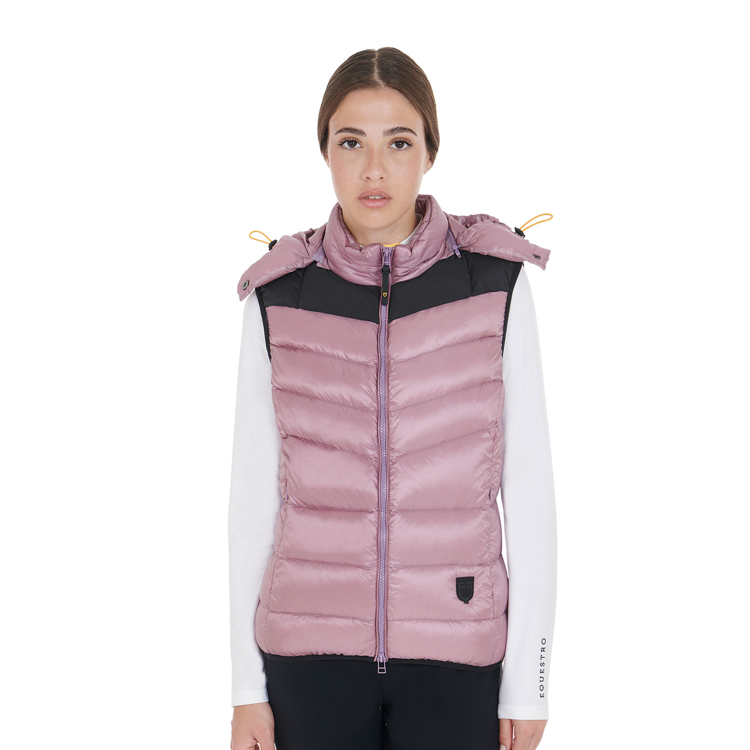 Une veste sans manches pour femme, réalisée en tissu technique matelassé, dotée d'une capuche amovible et réglable grâce à des lacets pratiques. Il peut être porté dans toutes les conditions météorologiques.