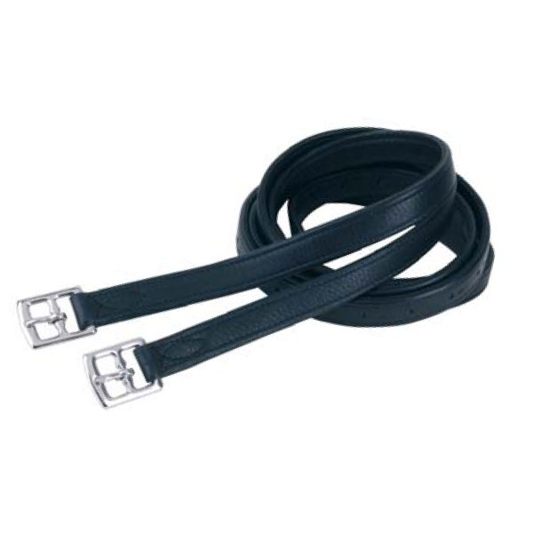Étrivières en nylon haute résistance, équipées de boucles en acier et recouvertes de cuir pleine fleur souple.