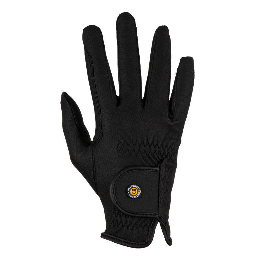 Les gants sont dotés d'un poignet élastique et d'une fermeture auto-agrippante durable pour un ajustement parfait, ornés du logo jaune Equestro.