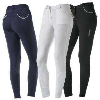 Fabriqué en tissu microfibre technique 39 % coton, 52 % nylon, 9 % élasthanne, poids 280 g. Poches avant terminées par passepoil contrasté et fausses poches arrière à rabat fermé par bouton bijou. Coupe arrière anatomique, grip en silicone antidérapant en forme de petits T au niveau du genou. Insert élastique à la cheville. Broderie Tattini sur la jambe gauche.
