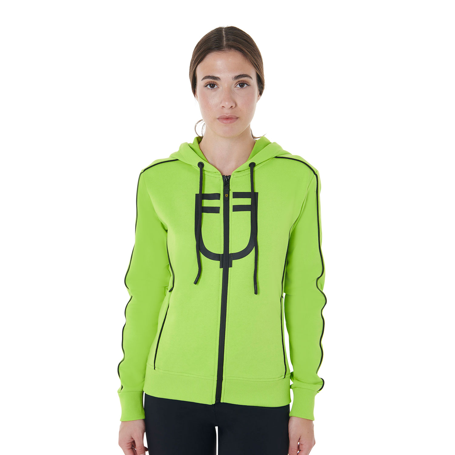 Un sweat-shirt pour femme en coton doux, avec le logo imprimé sur la poitrine. Il possède une capuche réglable avec un cordon de serrage, se ferme sur le devant avec un zip et possède des poignets et un ourlet élastiques pour un ajustement optimal. Les décorations avec passepoil contrasté sur les côtés et les épaules ajoutent une touche d'élégance, dans un parfait style équestre.