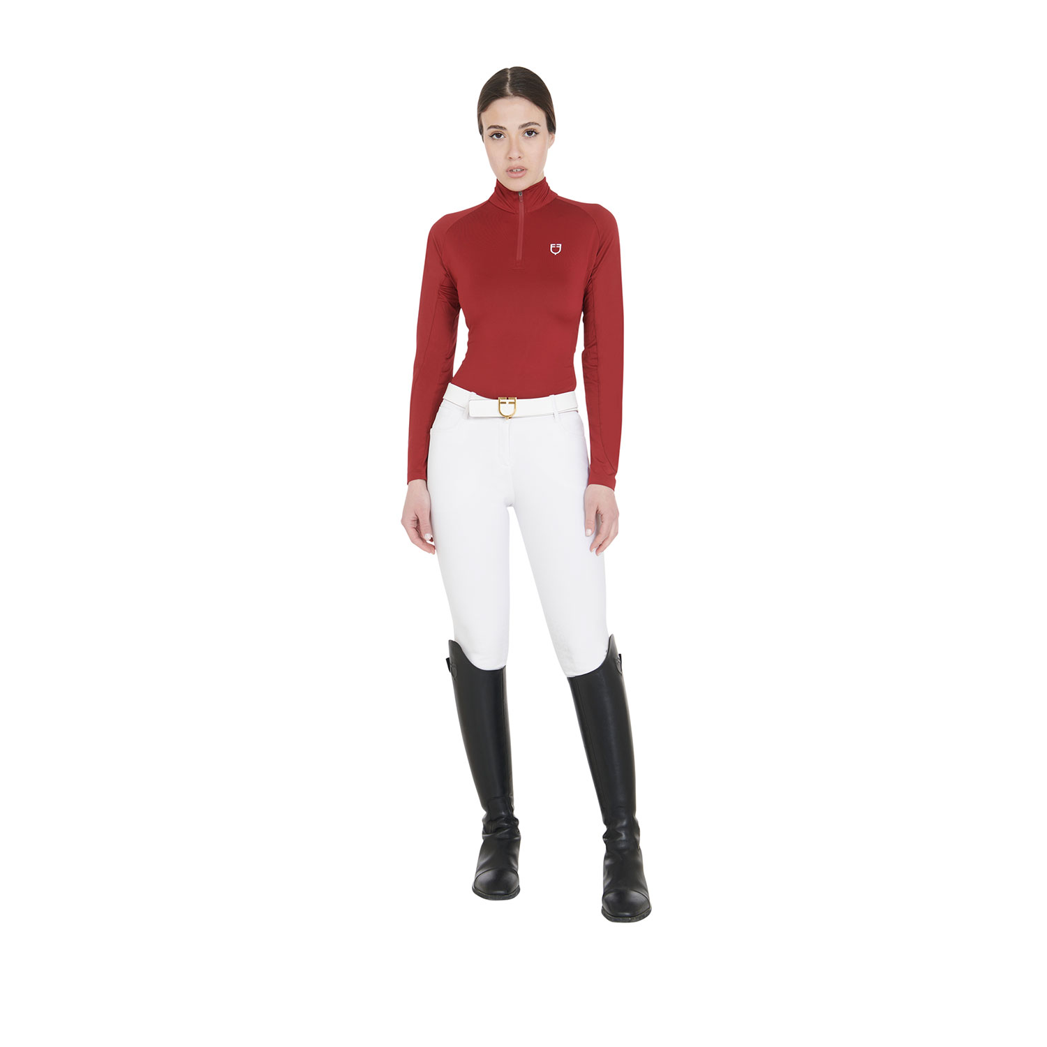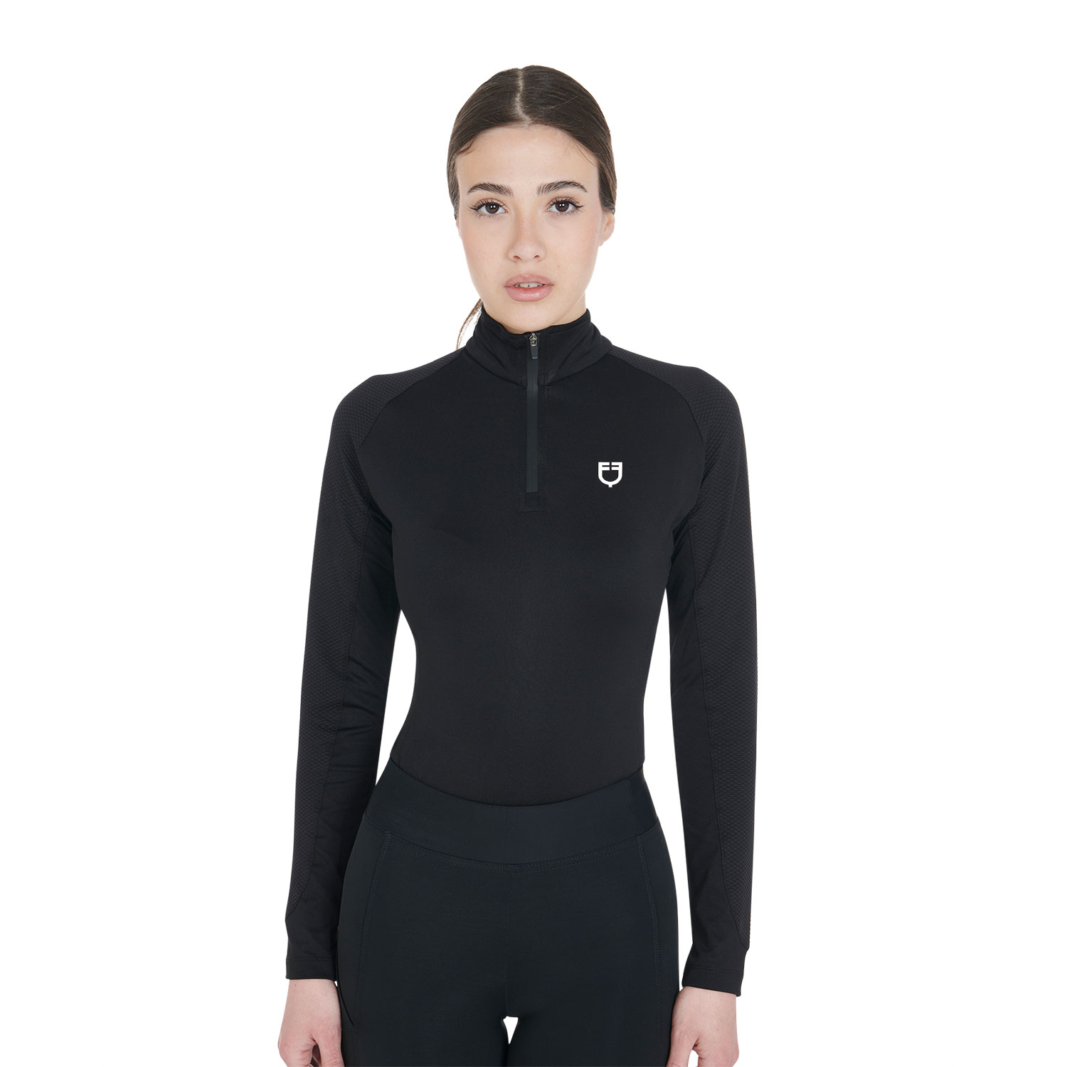 Aderente e a maniche lunghe, realizzato in tessuto tecnico traspirante, si rivela ideale per la primavera e l'autunno. Le lunghe maniche offrono protezione contro il freddo, mentre il materiale stretch in quattro direzioni favorisce la traspirazione e l'eliminazione del sudore. Il capo è arricchito da una zip con protezione antivento e presenta il logo Equestro sul lato sinistro del petto.