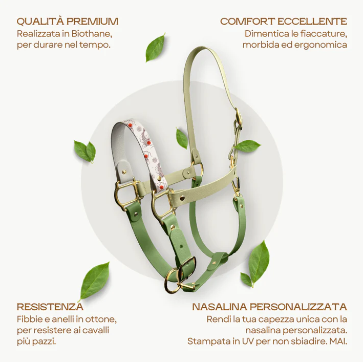 La capezza Prestige Loop è realizzata in Biothane, un’ecopelle morbida e resistente.