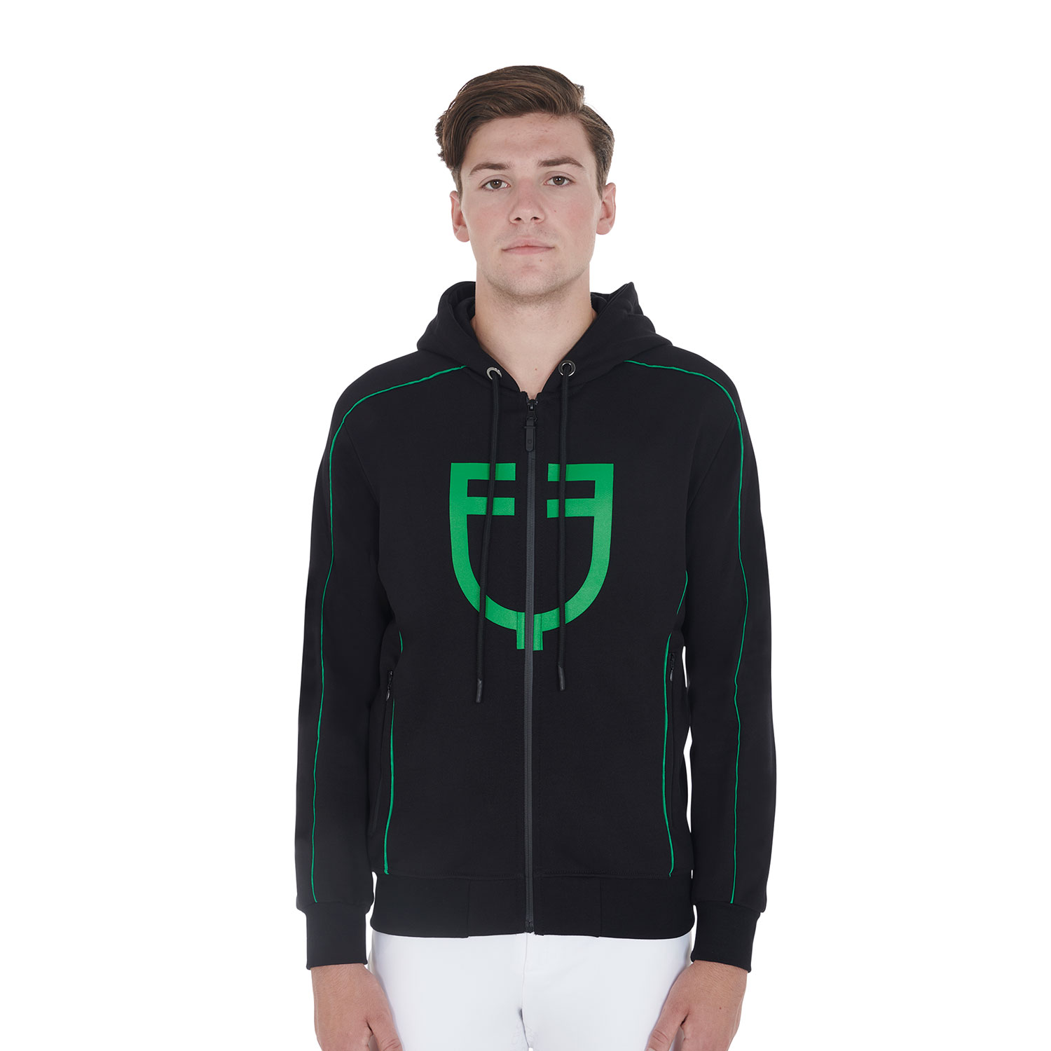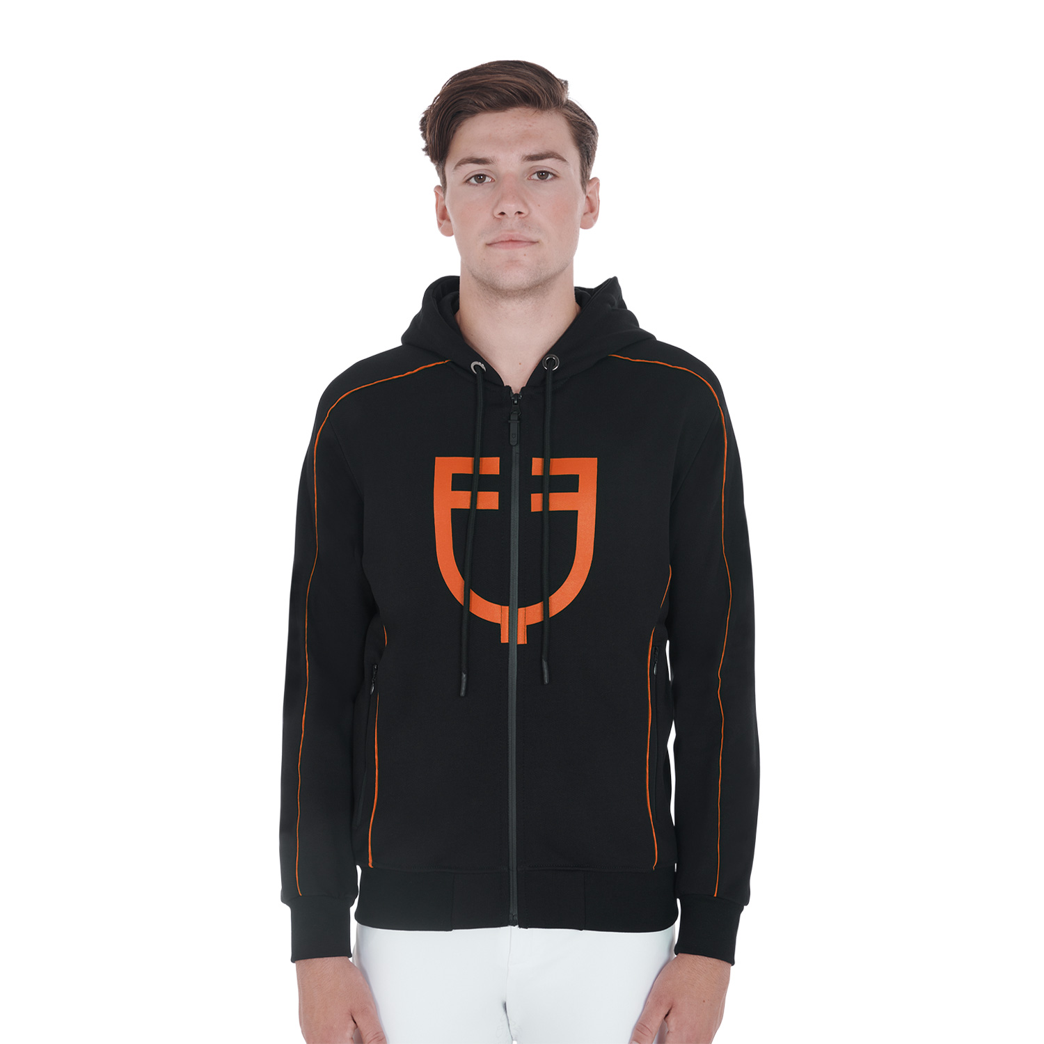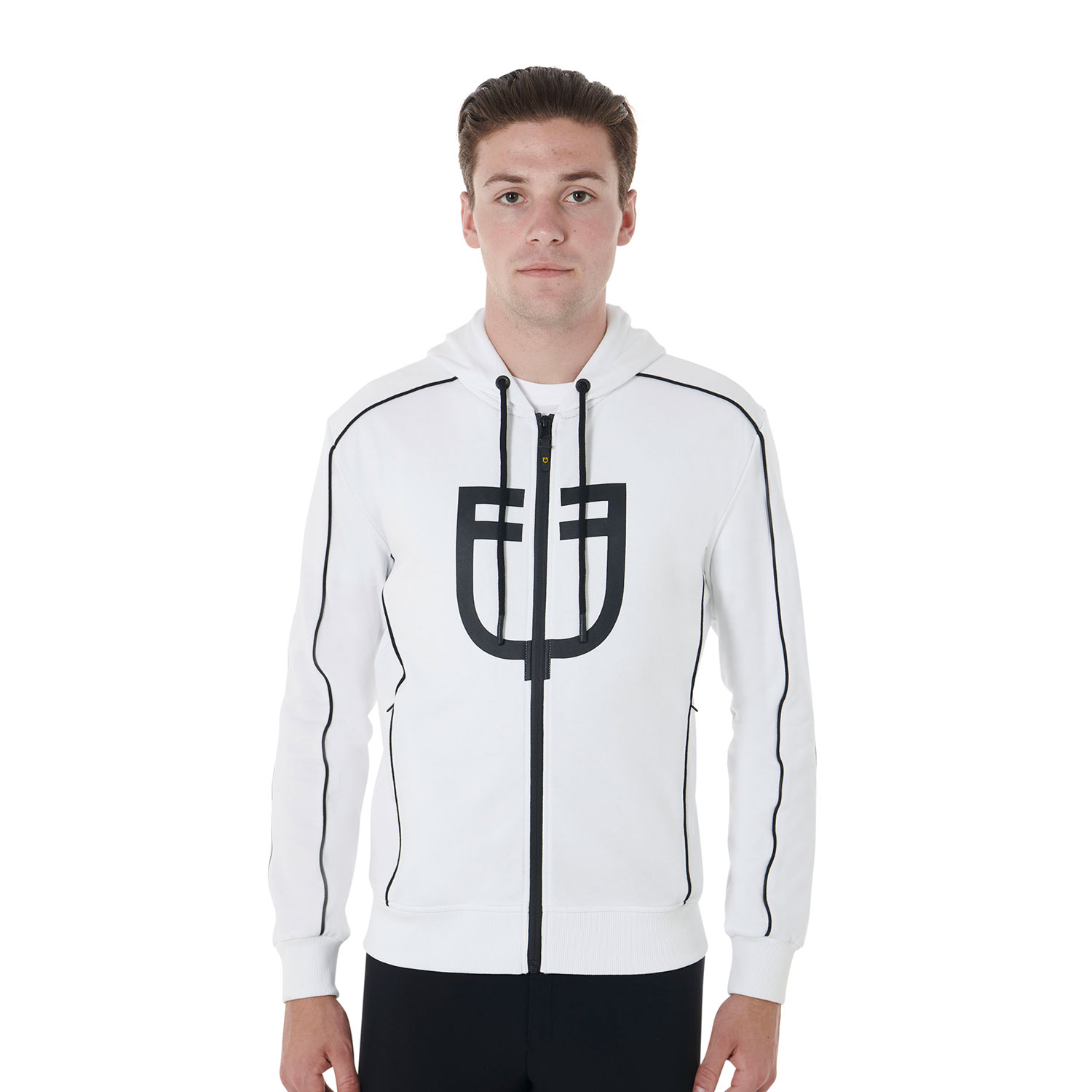 Felpa da uomo in soffice cotone, dotata di una comoda zip frontale antivento e di un cappuccio regolabile, pensata per offrire al cavaliere un comfort eccezionale. Le decorazioni con piping a contrasto donano un tocco di eleganza, rispecchiando appieno lo stile Equestro. I polsini e la fascia girovita a costine assicurano una vestibilità impeccabile.