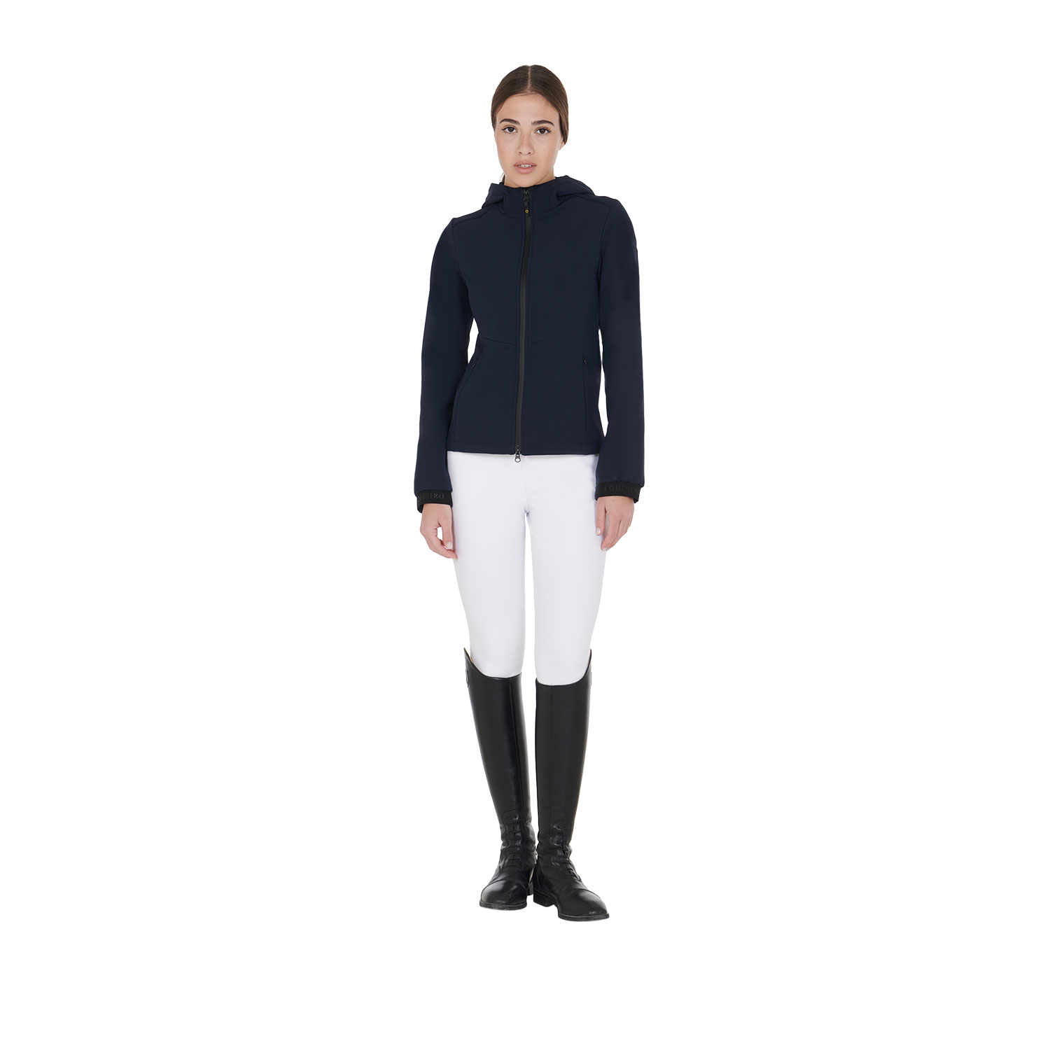 Include un pratico cappuccio regolabile, chiusura frontale con zip anti-vento, tasche con zip discrete e fasce elastiche personalizzate in vita e ai polsini.
