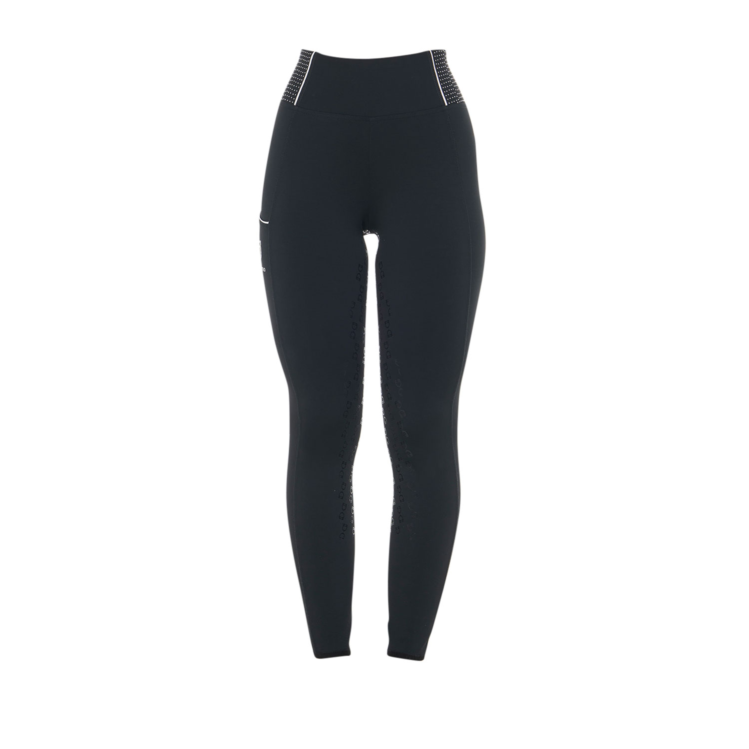 Leggings slim fit da donna in tessuto tecnico, perfetti per trattenere il calore durante le attività nei giorni più freddi. Realizzati con materiali traspiranti e di alta qualità, questi leggings allontanano efficacemente il sudore dal corpo, mantenendo l'atleta asciutta. Anche quando fa freddo, la temperatura corporea può aumentare, e questi leggings garantiscono il giusto equilibrio tra comfort e funzionalità. Il grip in silicone logato, posizionato strategicamente sulla parte posteriore e all'interno del ginocchio, migliora la posizione in sella e aumenta la stabilità, offrendo una presa sicura sulla sella e permettendo di concentrarsi sulla performance. Questi leggings sono dotati anche di una pratica tasca laterale per riporre gli oggetti essenziali. Il design versatile si adatta a molteplici stili, dal fashion allo sportivo. L'inconfondibile grafica Equestro aggiunge un tocco iconico, mentre il logo, gli strass in vita e il piping bianco donano un glamour scintillante, conferendo un'eleganza unica ai tuoi allenamenti.
