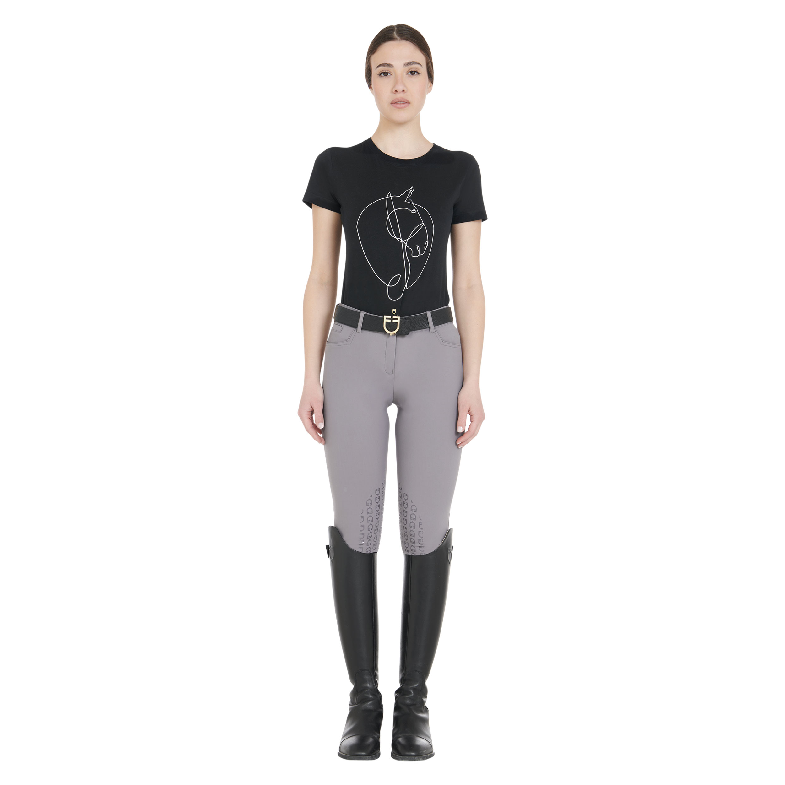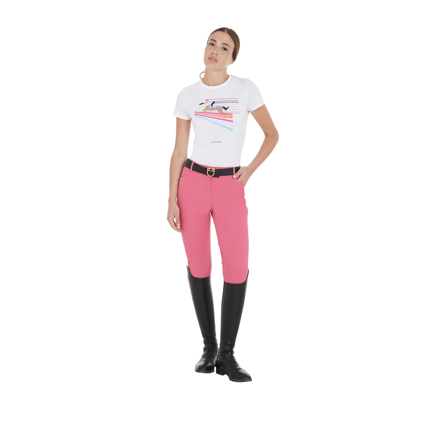 Pantaloni da donna dal taglio aderente, stile Slim Fit, realizzati con tessuto tecnologico bielastico e traspirante. Hanno inserti siliconati con il marchio Equestro posizionati sulla parte interna delle ginocchia.