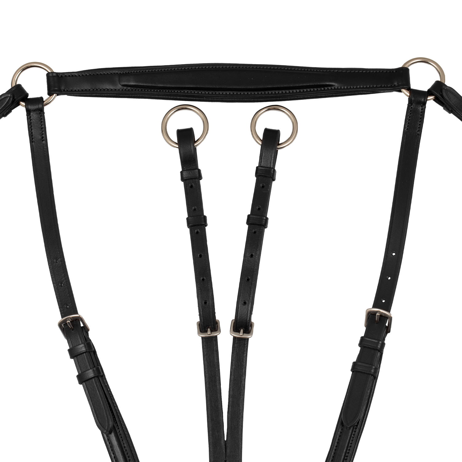 Pettorale in cuoio con tre punti di attacco e martingala rimovibile. Completamente regolabile in ogni punto di attacco, garantisce il massimo comfort per il cavallo.