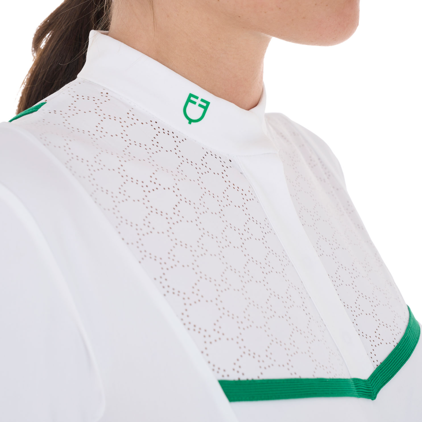 Polo da concorso da donna realizzata in un innovativo tessuto tecnico traspirante ed elastico progettata per garantire e conferire la massima libertà nei movimenti.