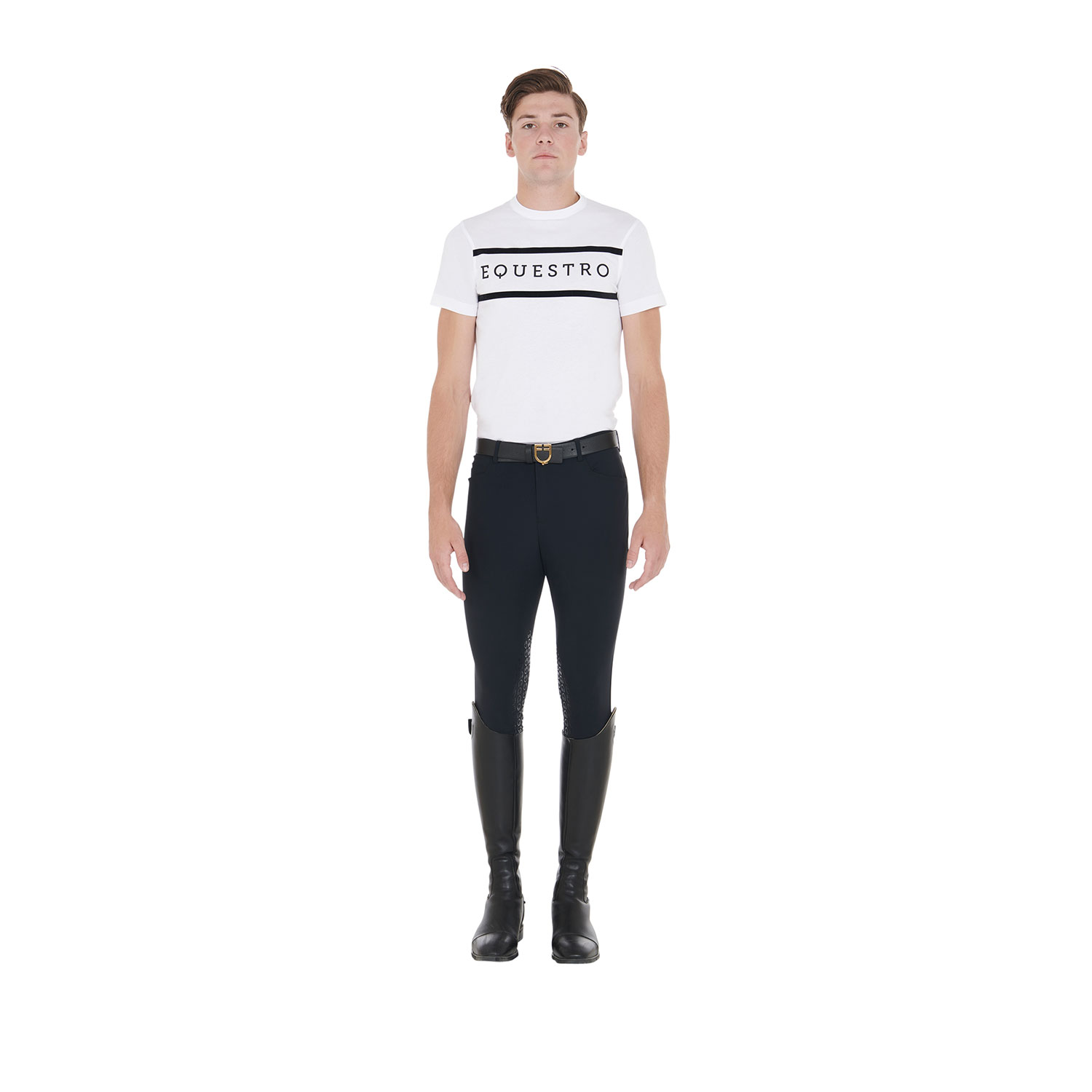 T-shirt slim fit da uomo in cotone morbido, ideale per un uso quotidiano con il caratteristico stile Equestro. Il design anatomico assicura una perfetta vestibilità, comfort ottimale e libertà di movimento. Caratterizzata da una scritta Equestro a contrasto sul petto.